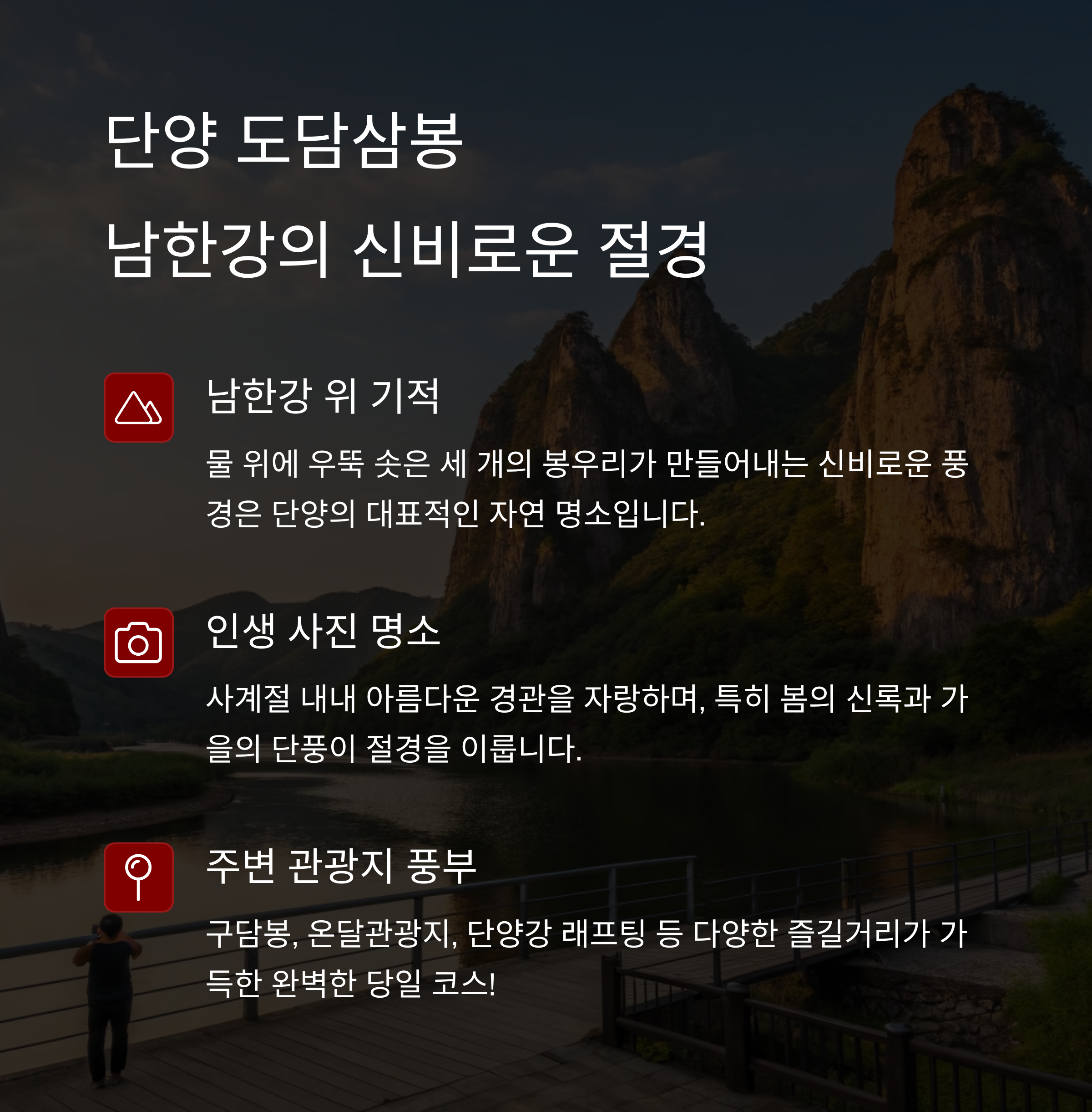 단양 도담삼봉은 남한강 위에 떠 있는 세 개의 봉우리로, 자연이 만들어낸 아름다운 풍경이 인상적입니다. 특히 일출과 일몰 시간대에는 봉우리 사이로 비치는 햇빛이 환상적입니다. 주변에 단양팔경 중 하나인 석문과 고수동굴도 있어 당일치기로 여유롭게 둘러보기 좋습니다.