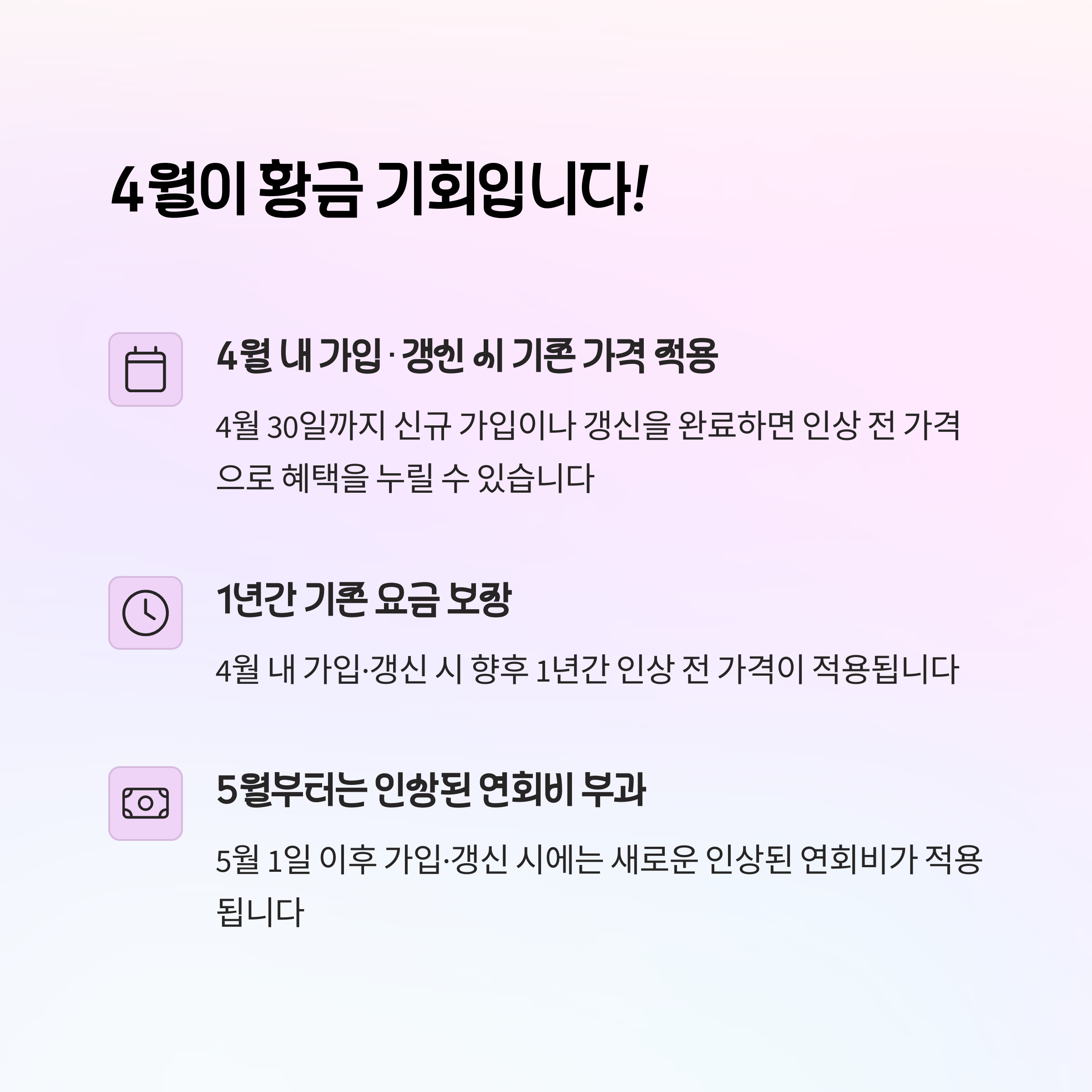 - 기존 회원도 만기 전 갱신 시 5월 이전이면 기존 가격 적용