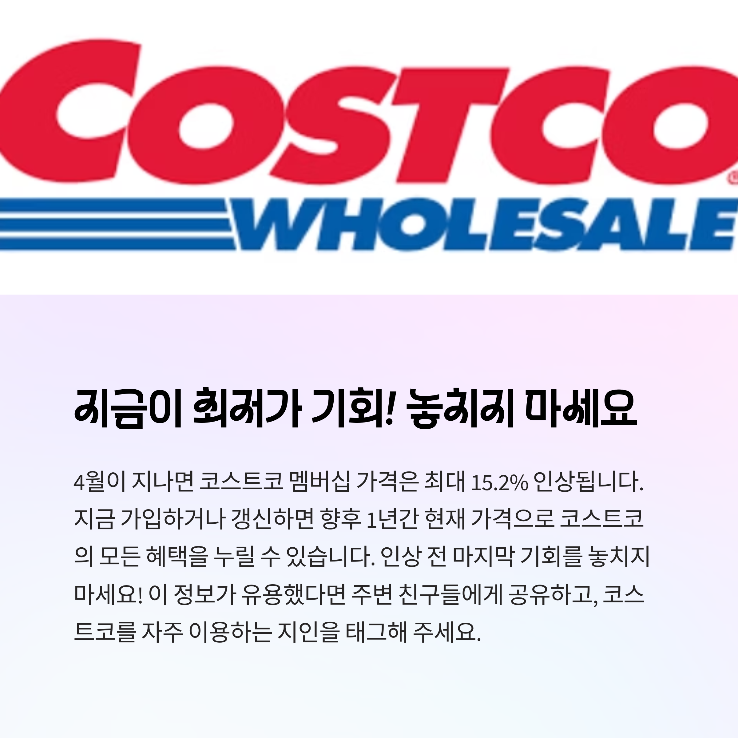 “코스트코 갱신 언제 할까?” “해지하면 환불 받을 수 있을까?” 최근 코스트코 연회비 인상 소식에 이런 고민 하시는 분들 많으실 텐데요. 2025년 5월 1일부로 연회비가 4,500원~6,000원 인상되며, 기존 회원도 갱신 시점이 5월 이후면 인상된 금액이 적용됩니다. 지금 이 글에서 가입·갱신·해지에 대한 핵심 정보를 한 번에 확인하고, 실질적으로 연회비를 절약할 수 있는 팁까지 챙겨가세요!