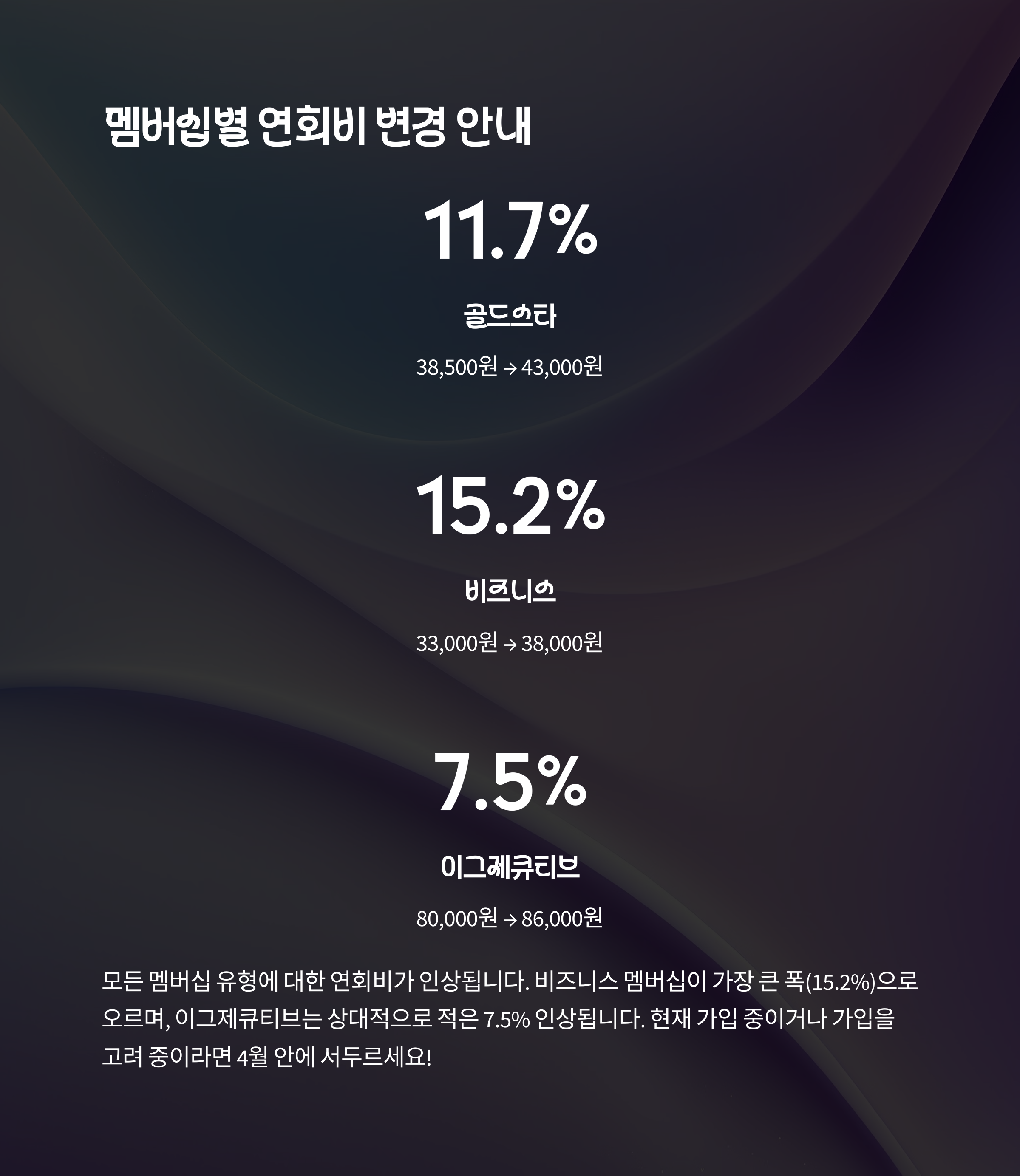| 회원 종류 | 현재 연회비 | 5월 이후 인상 가격 | 인상액 |