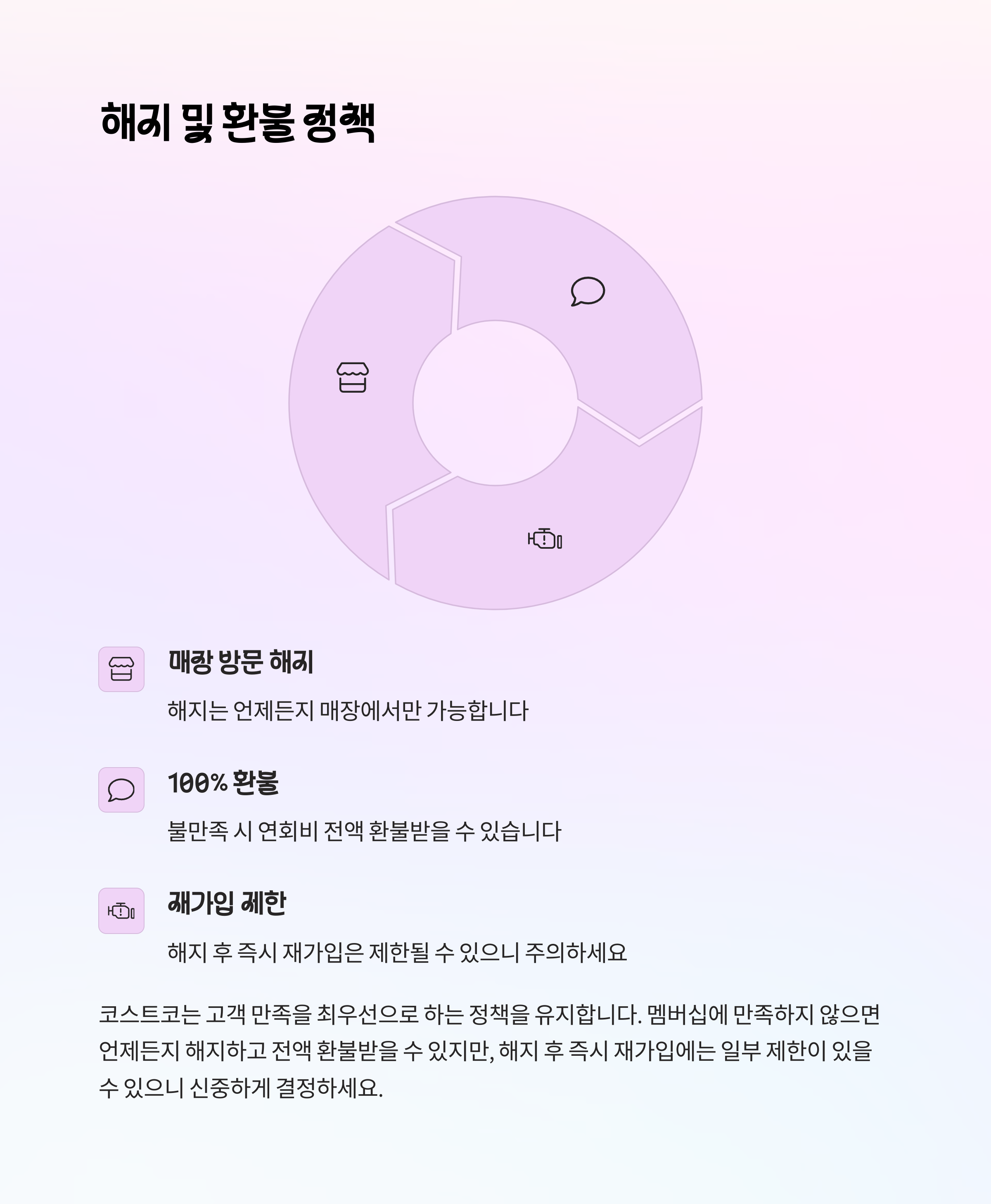 회원권 해지는 불만족 시 손쉽게 탈퇴할 수 있는 소비자 권리로, 만족 보장 정책을 잘 활용하면 부담 없이 체험해볼 수도 있습니다.