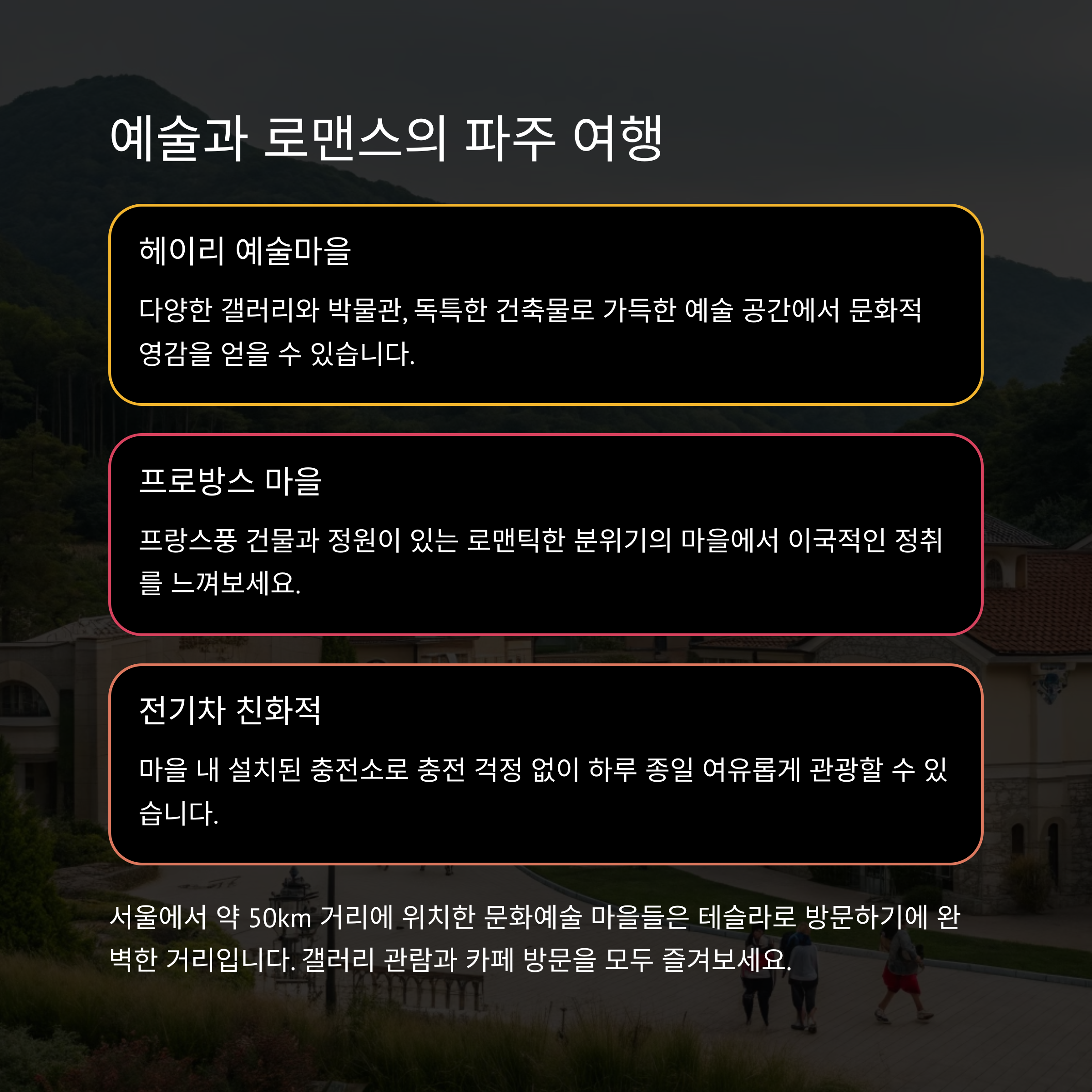 서울에서 약 50km 거리에 위치한 파주 헤이리 예술마을은 예술과 문화가 공존하는 창작 마을입니다. 갤러리와 카페, 공방들이 조화를 이루며 예술적 감성을 느낄 수 있습니다. 인근의 프로방스 마을은 프랑스 남부를 연상시키는 감성적인 풍경으로 유명하며, 야경도 아름답습니다. 주차장 근처에는 테슬라 전용 충전소가 있어 충전 걱정 없이 방문할 수 있습니다.