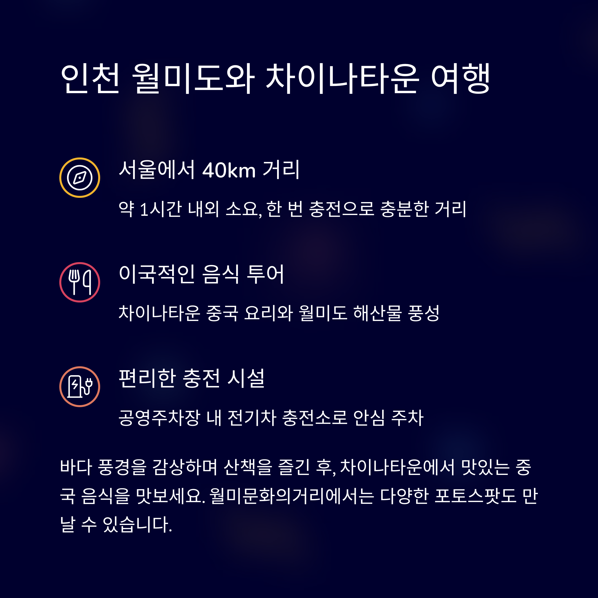 서울에서 약 40km 거리로, 테슬라 전기차로 1시간 이내에 도착할 수 있는 인천 월미도는 바다 풍경과 다양한 즐길 거리가 있는 명소입니다. 월미문화의 거리에서는 놀이기구를 즐길 수 있고, 월미공원 전망대에서 인천항의 탁 트인 풍경을 감상할 수 있습니다. 인근에 위치한 차이나타운은 정통 중국 음식을 맛볼 수 있는 곳으로 유명합니다. 간짜장과 탕수육 등 다양한 요리를 맛본 후 붉은색 건물들이 늘어선 거리에서 인증샷을 남겨보세요.
