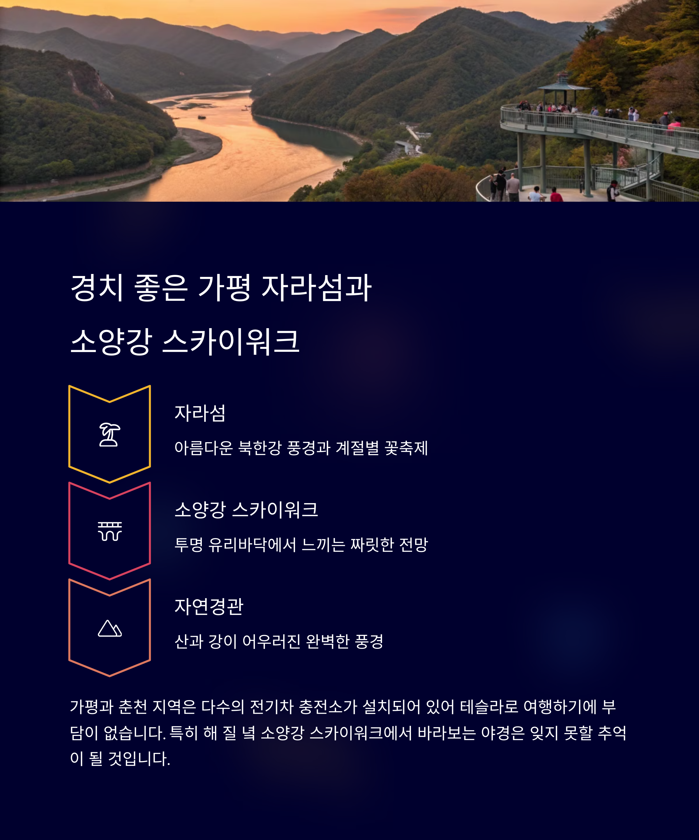 서울에서 약 70km 떨어진 가평 자라섬은 캠핑과 자연을 동시에 즐길 수 있는 힐링 공간입니다. 섬 곳곳에 피어나는 계절 꽃과 함께 자연 속 여유를 만끽할 수 있으며, 주말마다 열리는 문화 행사도 매력적입니다. 춘천 소양강 스카이워크는 강 위를 걷는 듯한 스릴을 느낄 수 있는 곳으로, 야경이 특히 아름답습니다.
