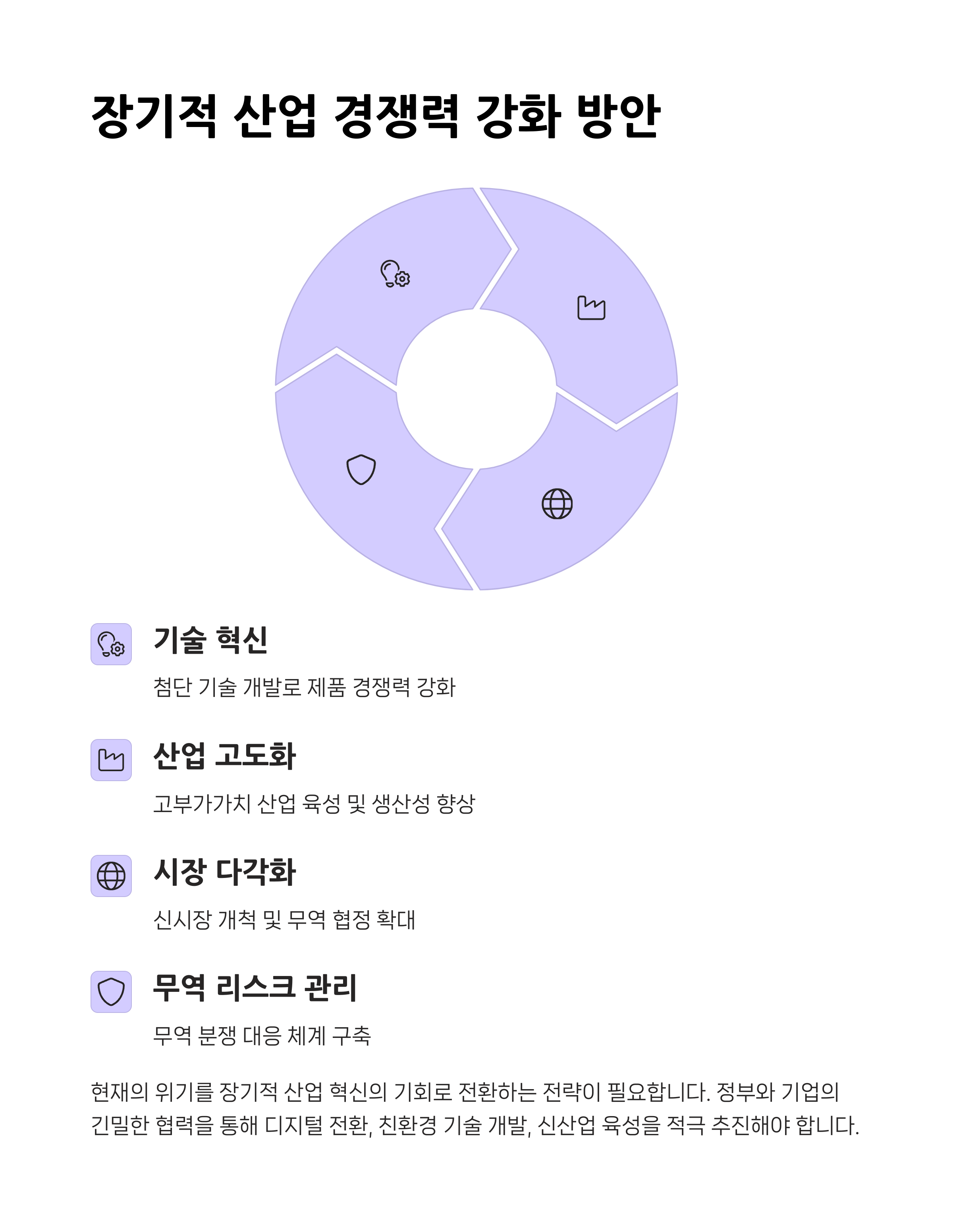 트럼프의 관세 부과 이후, 수출 시장 다변화와 산업 경쟁력 강화를 위한 구체적인 방안이 제시되고 있습니다. 특히 중소기업의 해외 진출을 지원하는 프로그램이 활성화되어야 하며, 기존 대기업 중심의 수출 구조를 다변화하는 것이 필요합니다.