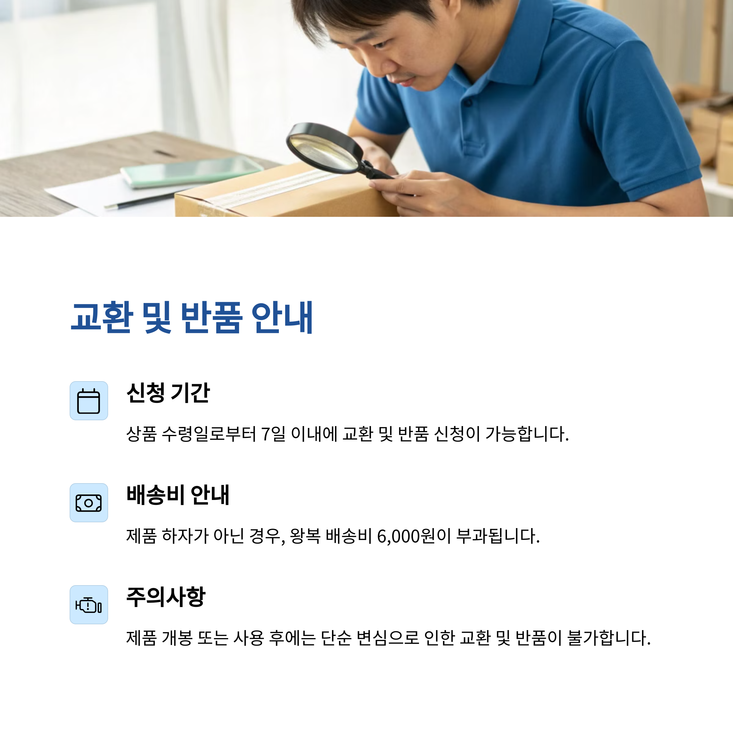 - 교환 및 반품은 상품 수령일로부터 7일 이내에 가능합니다.