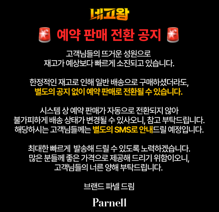 A: 사전 예약 제품은 주문 후 약 7~10일 소요되며, 순차적으로 발송됩니다. 제품별로 배송 일정이 다를 수 있으니, 구매 시 공지사항을 확인해주세요.
