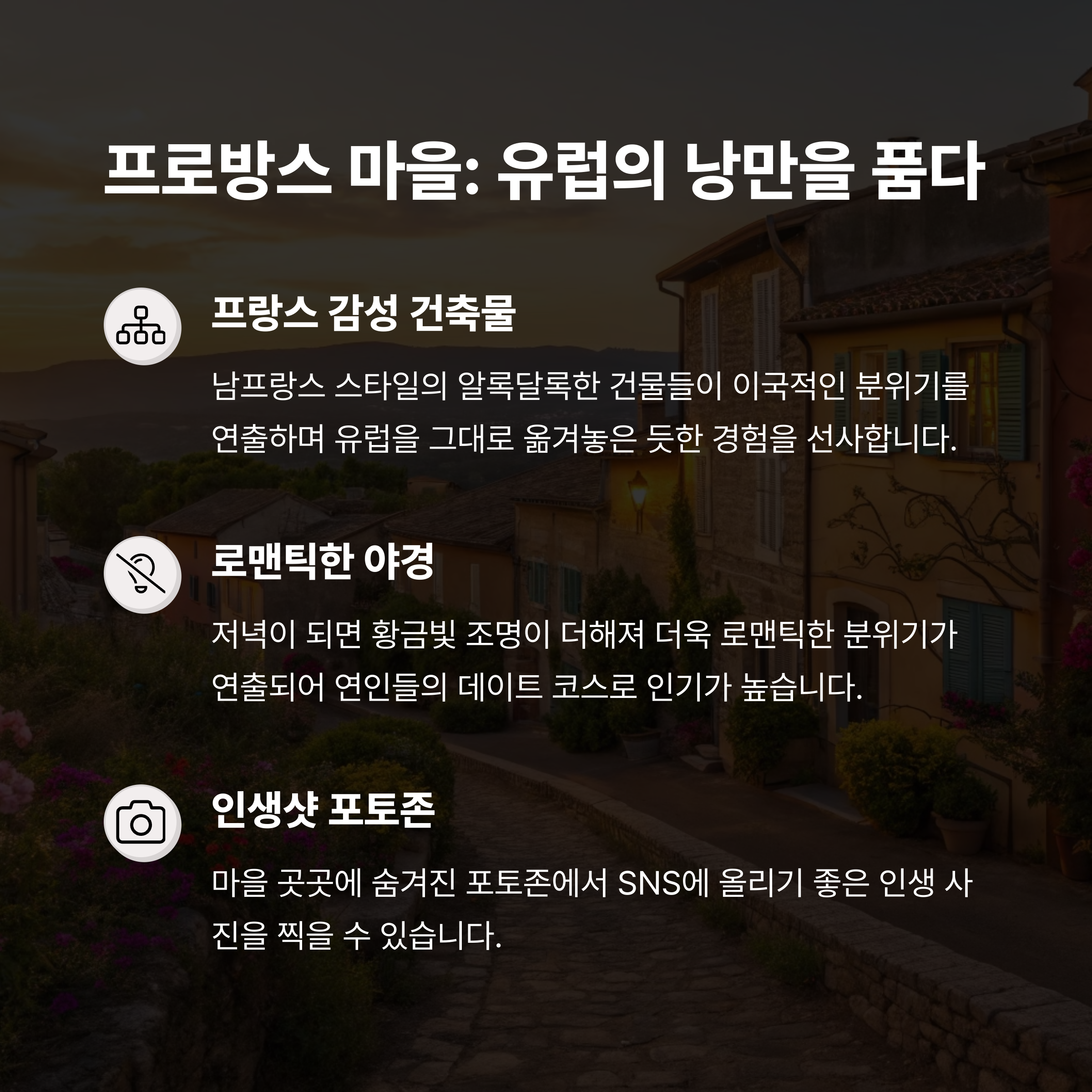 프로방스 마을은 프랑스 남부를 연상시키는 알록달록한 건물들이 줄지어 있는 유럽풍 마을입니다. 아기자기한 소품샵과 예쁜 베이커리가 많아 감성 사진을 찍기에 좋은 명소로 손꼽힙니다. 저녁이 되면 조명이 켜지며 더욱 로맨틱한 분위기가 연출되어 데이트 코스로도 인기가 높습니다.