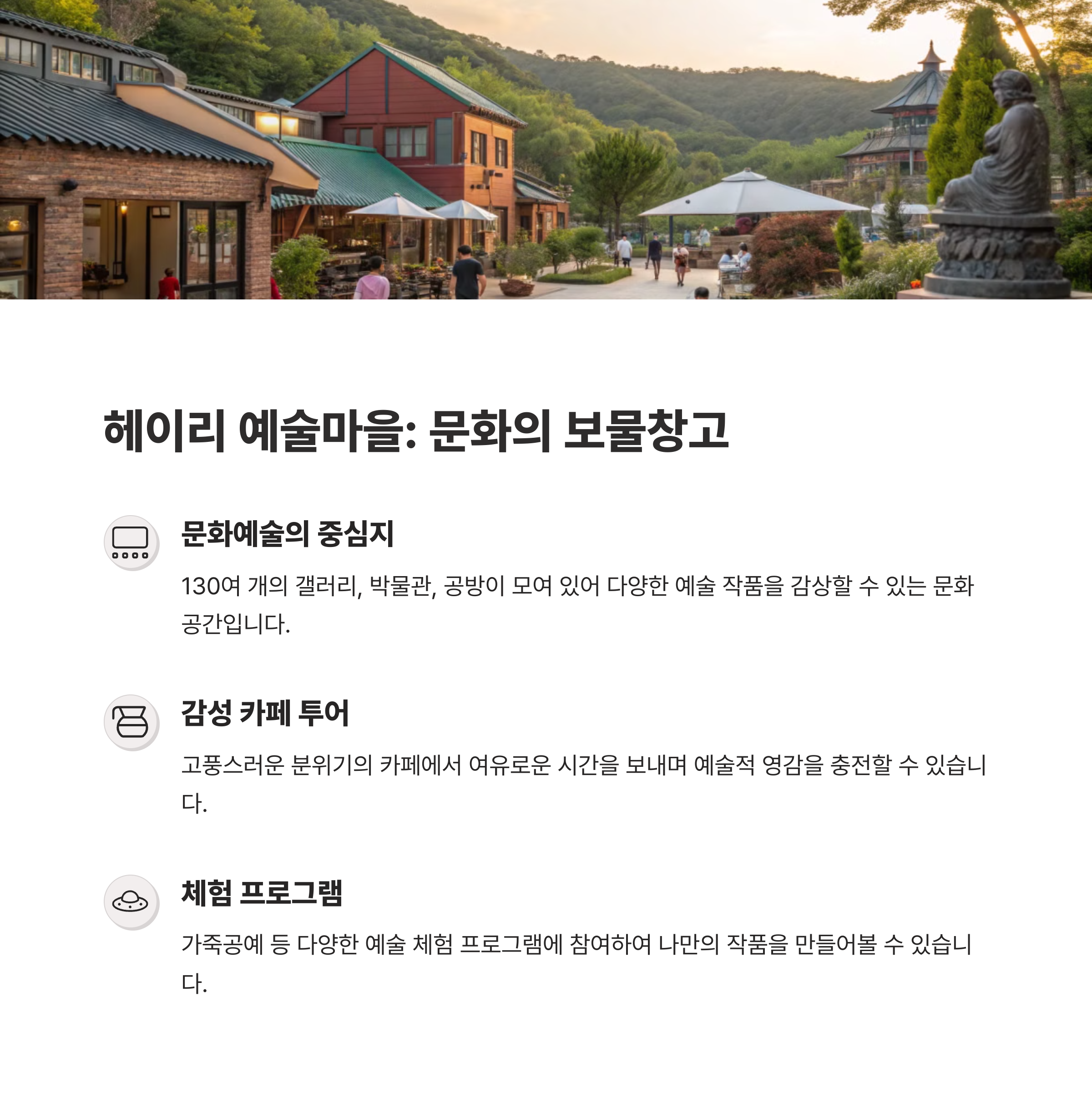 파주는 예술과 자연, 역사가 공존하는 매력적인 여행지입니다. 헤이리 예술마을에서 감성을 느끼고, 프로방스 마을에서 유럽 분위기를 만끽하며, 임진각 평화누리공원에서 역사의 무게를 되새겨보는 일정은 하루 동안 다양한 감정을 느끼게 해주는 특별한 경험이 됩니다.