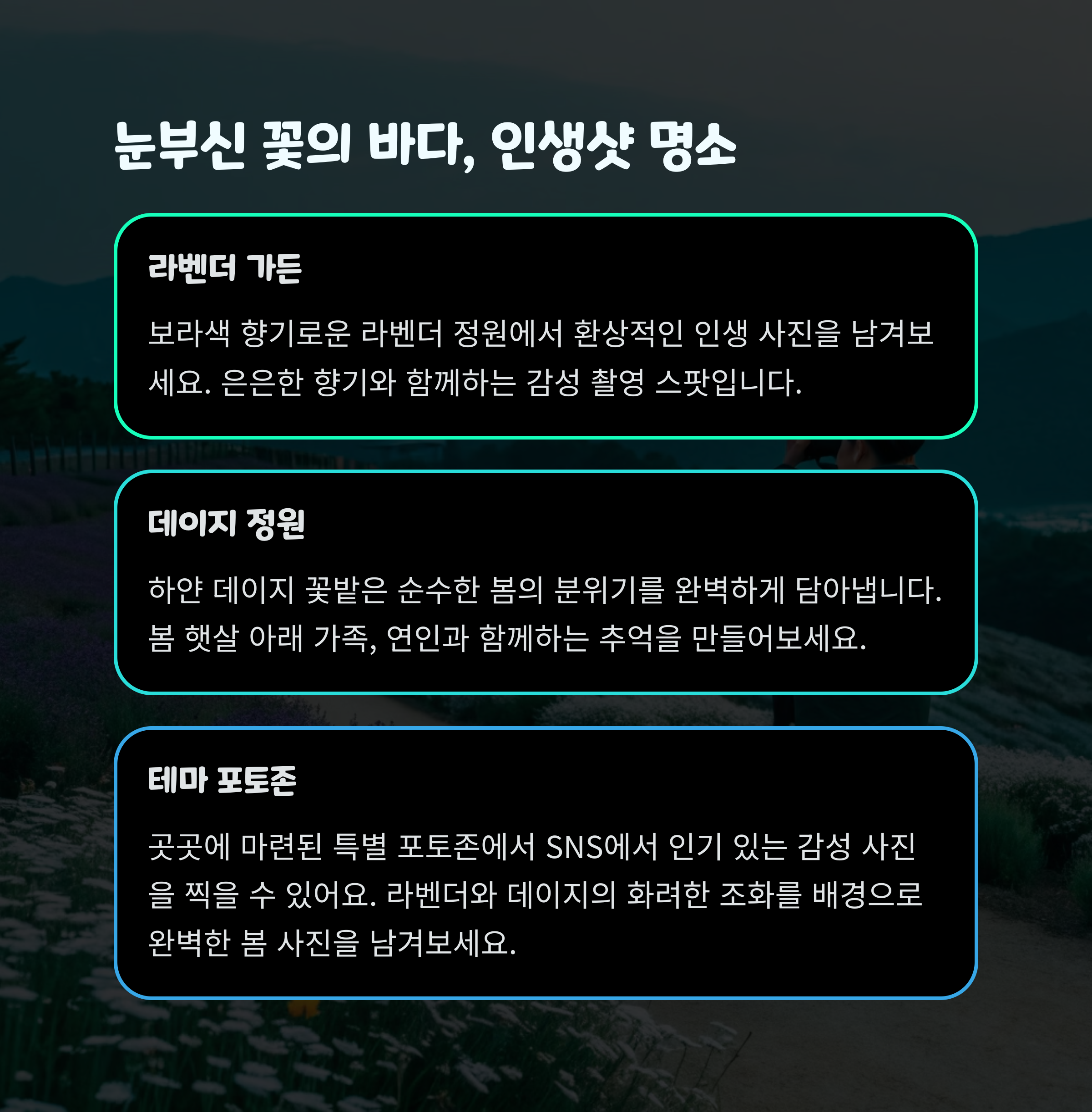 | 방문 시기 | 6월 중순~말이 라벤더 만개 시기로 사진 촬영에 최적 |