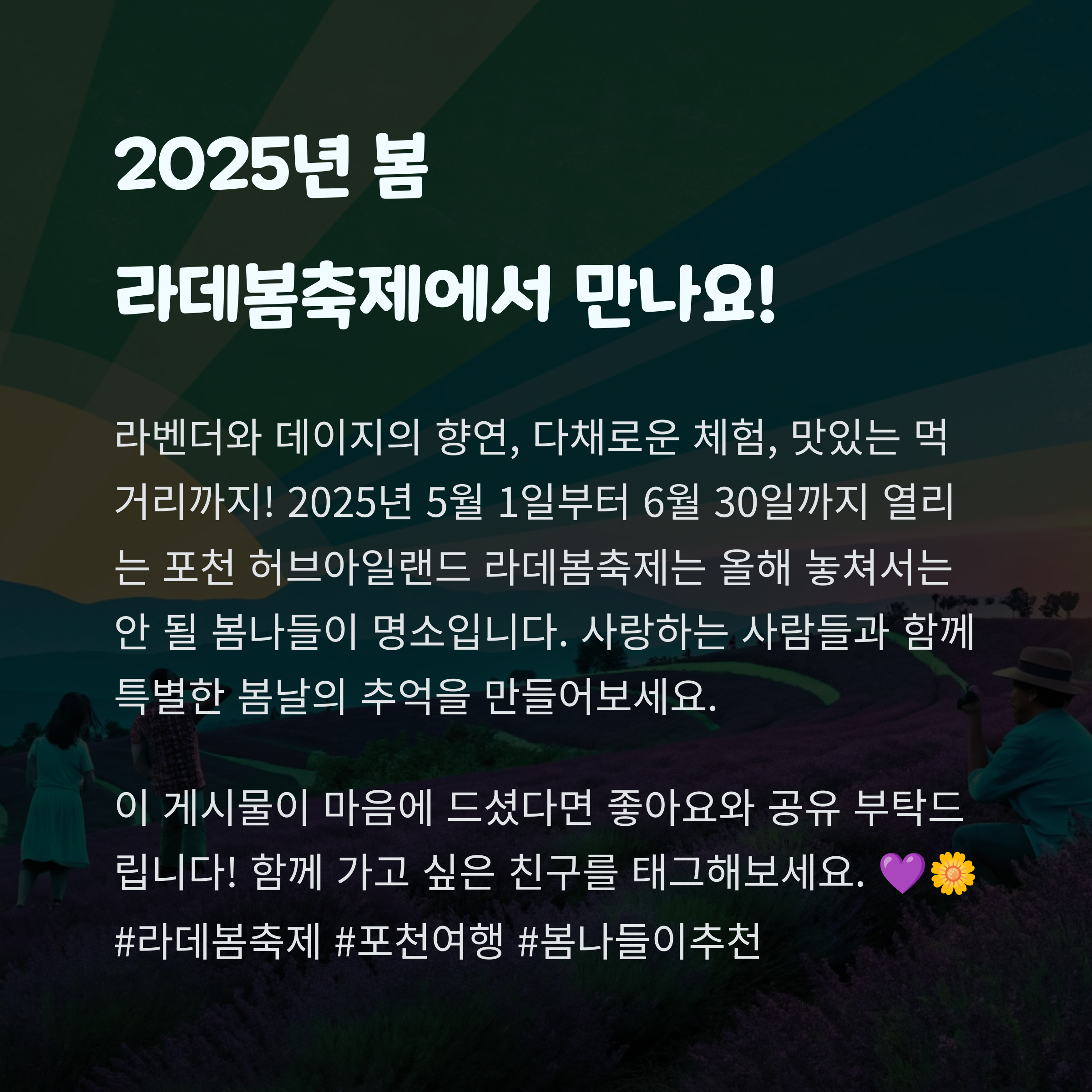 안녕하세요! 오늘은 봄꽃과 허브 향기를 동시에 느낄 수 있는 환상적인 봄 축제를 소개해드리려고 해요. 바로 경기도 포천에 위치한 허브아일랜드에서 열리는 ‘2025 라데봄축제’인데요. 개인적으로도 지난 해 가족과 함께 다녀와서 정말 좋은 기억이 많았던 곳이라 더욱 애정이 가는 축제예요. 특히 라벤더 정원의 진한 향기와 보랏빛 풍경은 지금도 잊을 수 없답니다. 올해는 어떤 체험과 꽃들이 기다리고 있을지, 함께 알아보며 이번 봄나들이 코스를 미리 계획해보는 건 어떨까요?