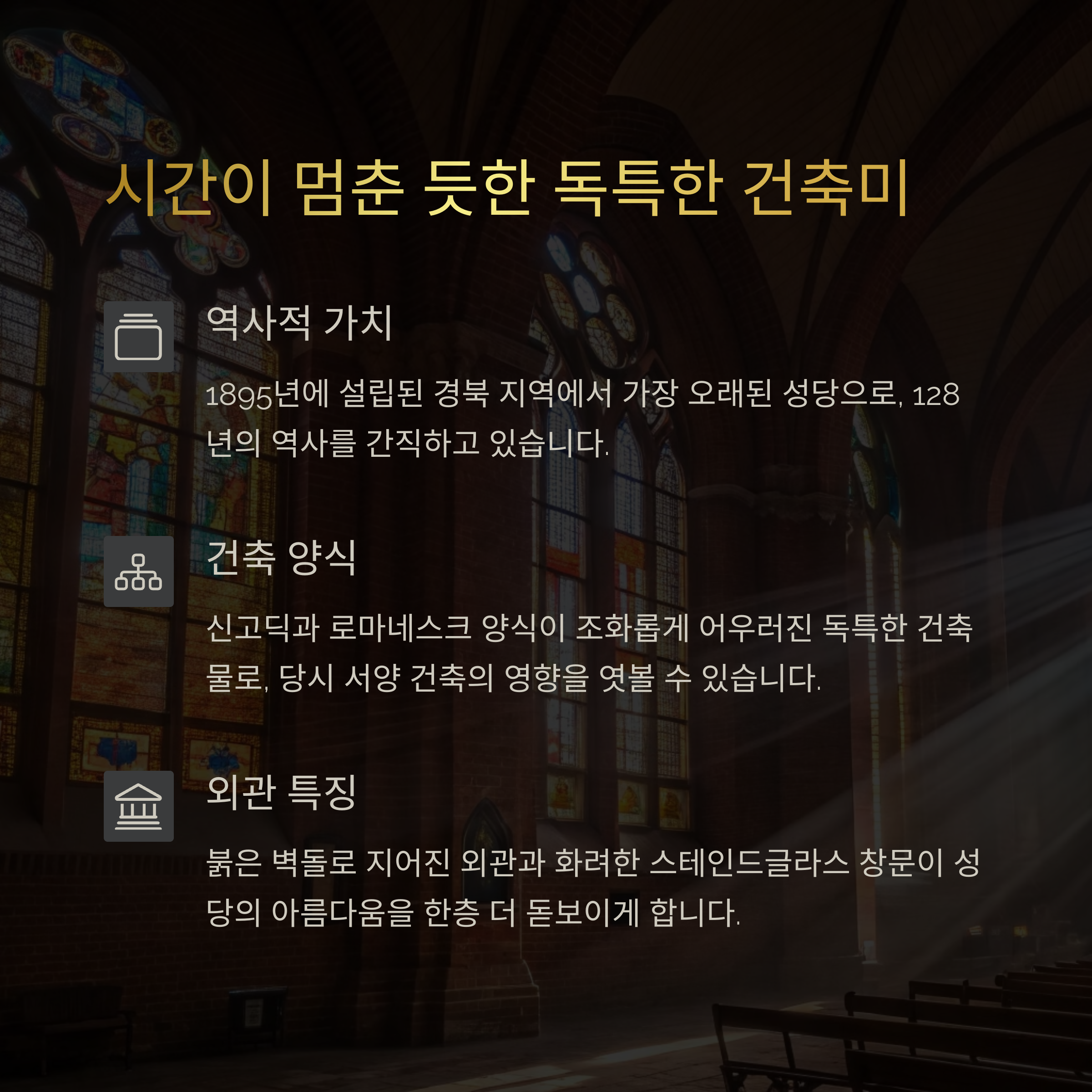 안녕하세요! 오늘은 경상북도 칠곡군에 위치한 가실성당을 소개하려고 합니다. 이 성당은 1895년에 설립된 경북 지역에서 가장 오래된 성당으로, 최근 드라마 '폭싹 속았수다'에서 결혼식 장면 촬영지로 사용되면서 큰 관심을 받고 있습니다. 고풍스러운 붉은 벽돌 외관과 독일 장인이 제작한 스테인드글라스 창문이 어우러진 이곳은 마치 유럽의 작은 성당을 연상케 합니다.