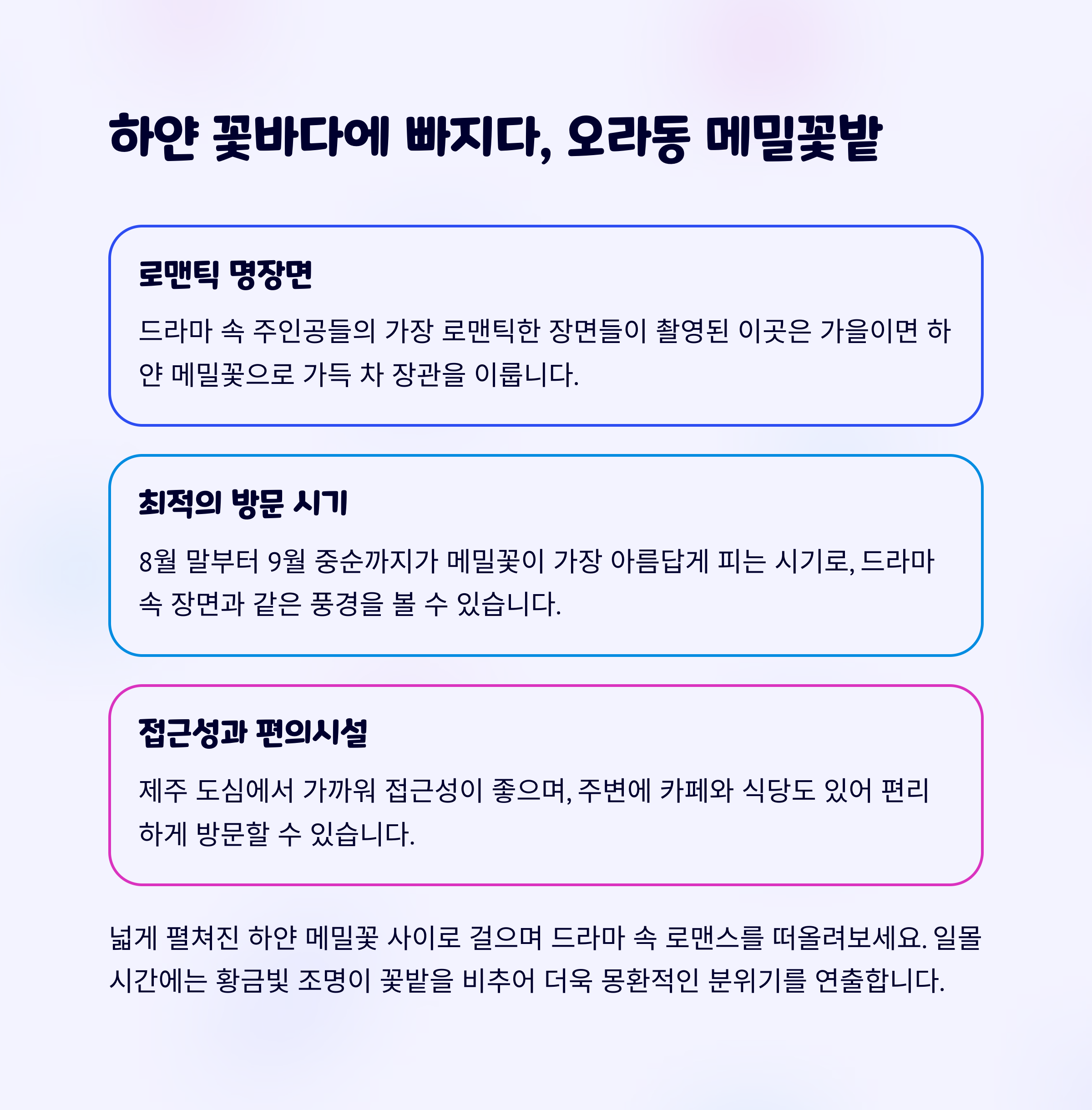 그 장면의 배경이 바로 오라동 메밀꽃밭이랍니다. 계절에 따라 풍경이 달라지지만, 가을에는 정말 영화처럼 낭만적인 풍경을 만날 수 있어요. 인생샷 찍기에도 그만인 곳이니, 드라마 팬이라면 무조건 들러야 합니다!