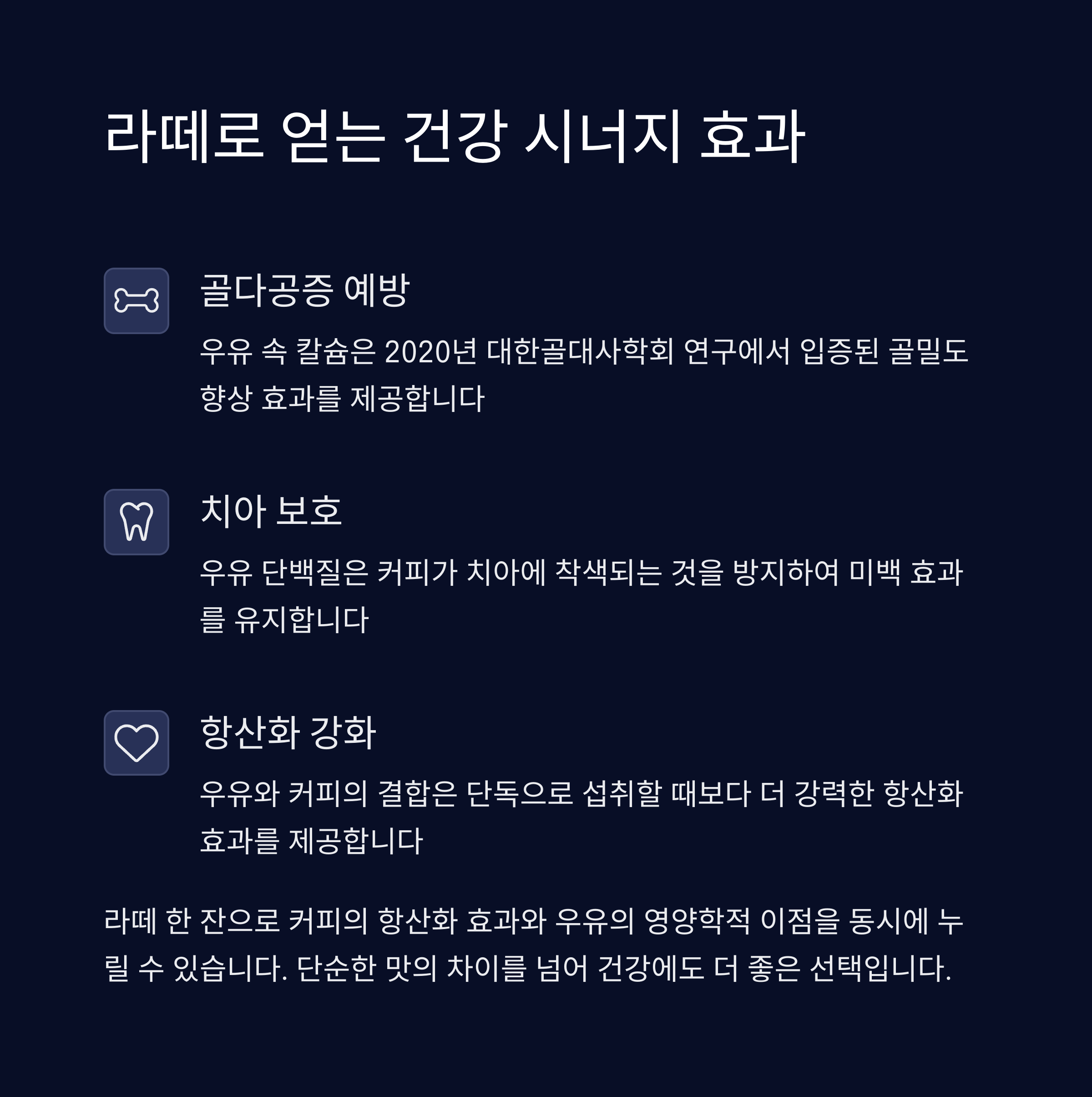 즉, 커피+우유 조합은 항염증 작용뿐만 아니라 대사·면역·노화 억제 등 복합 건강 효과를 동시에 누릴 수 있는 조합이라는 의미입니다.