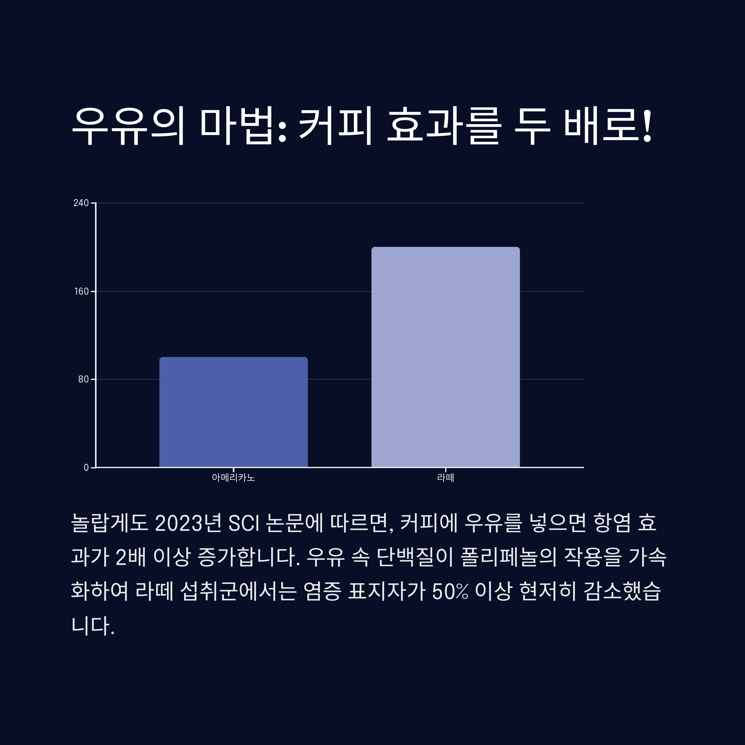 즉, 커피+우유 조합은 항염증 작용뿐만 아니라 대사·면역·노화 억제 등 복합 건강 효과를 동시에 누릴 수 있는 조합이라는 의미입니다.