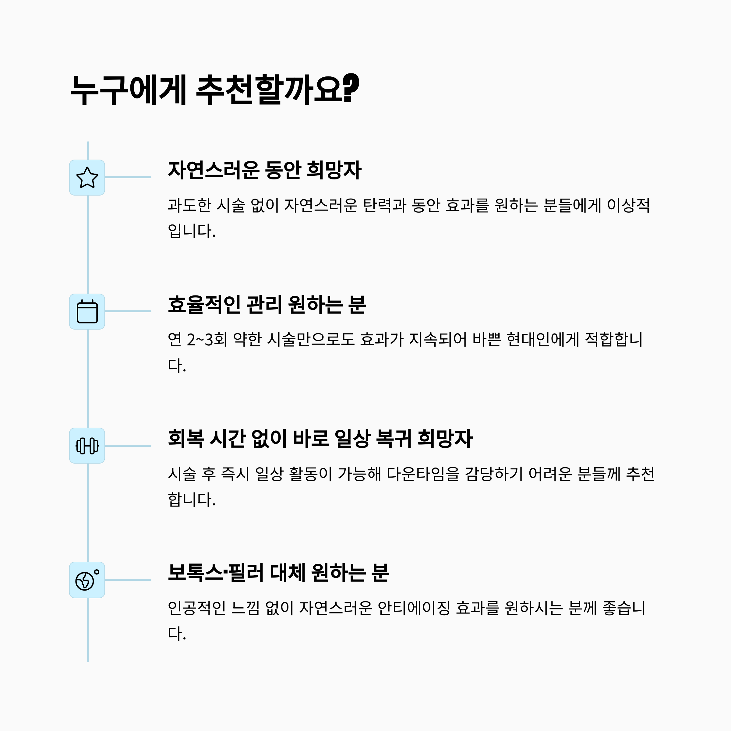특히 시술 후 일상 복귀가 빠르길 원하는 직장인이나 육아맘, 보톡스·필러는 부담되지만 피부 처짐은 신경 쓰이는 분들에게 추천됩니다. 반복적인 약한 시술로 탄력 개선을 꾸준히 누리고 싶은 분들께도 잘 맞는 편입니다.