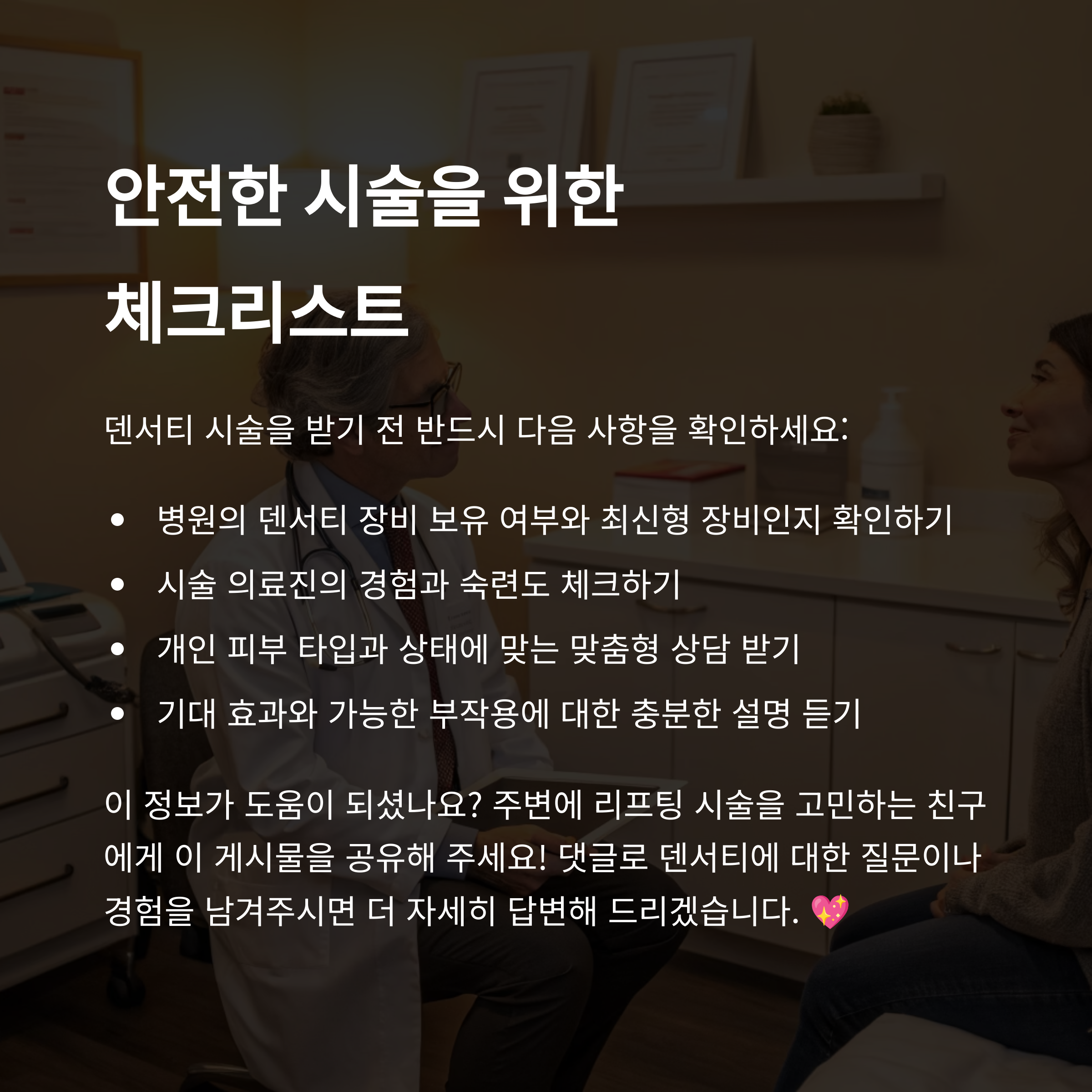덴서티는 저자극 리프팅이지만, 병원마다 장비 차이와 시술 숙련도에 따라 결과가 달라질 수 있습니다. 모든 피부과가 덴서티 장비를 보유하고 있는 건 아니기 때문에 예약 전에 확인이 필요하며, 민감성 피부나 염증이 있는 경우에는 반드시 상담 후 진행하는 것이 안전합니다. 시술 전후 음주나 사우나는 피하는 것이 좋습니다.