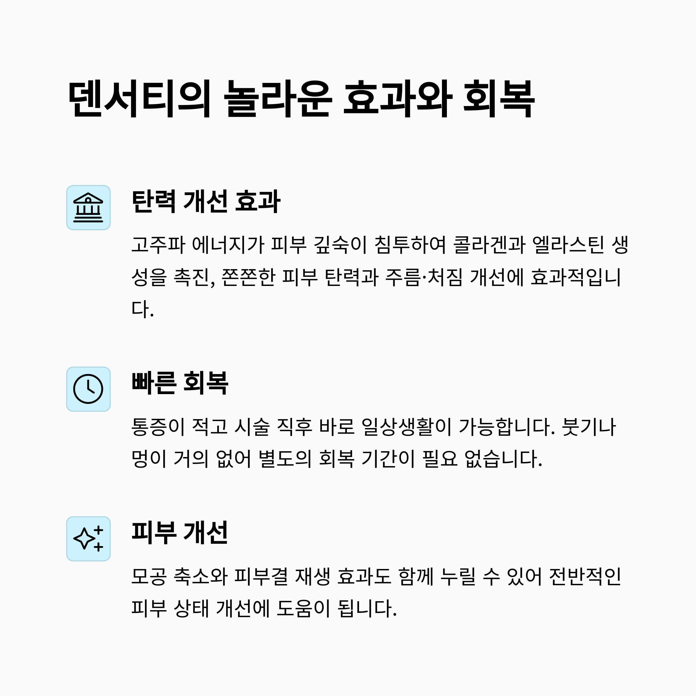 덴서티는 강한 리프팅보다 자연스러운 피부 개선을 원하는 분들에게 적합합니다.