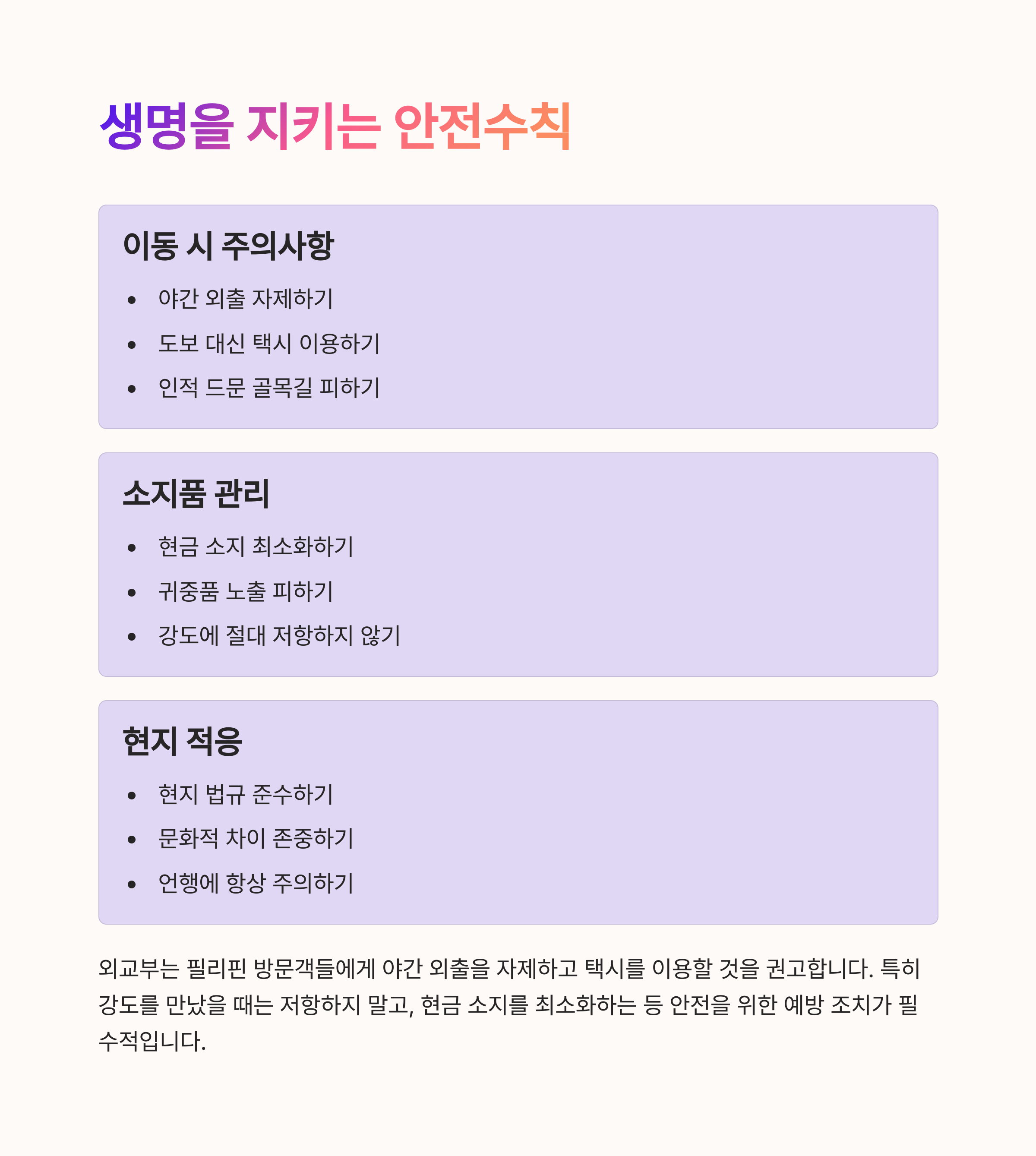 필리핀 앙헬레스는 더 이상 ‘가볍게 다녀오는 여행지’가 아닙니다. 사건이 반복되는 곳에는 이유가 있고, 경고가 누적된 지역은 언제든 당신의 이름이 뉴스에 오를 수 있는 곳이 됩니다. 여행은 추억이어야지, 비보가 되어선 안 됩니다. 지금 이 순간에도 누군가는 같은 실수를 반복할 수 있습니다. 이 글이 당신과 누군가의 ‘예방’이 되기를 바랍니다.