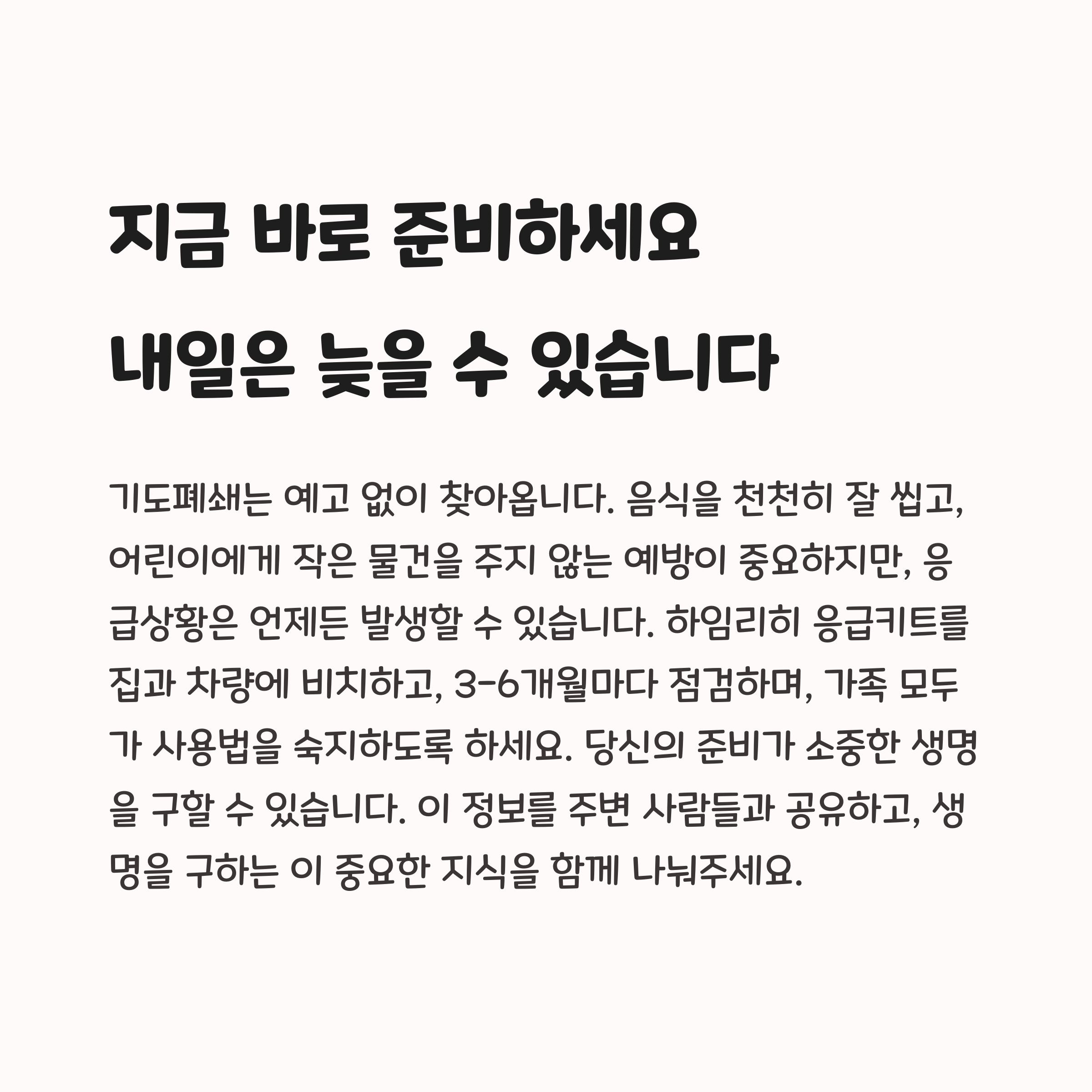 응급상황은 예고 없이 찾아오기에 미리 대비하는 것이 가장 중요합니다. 특히 기도폐쇄는 신속한 대처가 생명을 구할 수 있는 중요한 상황입니다. 하임리히 응급키트를 집과 차량에 비치하여 언제든 사용할 수 있도록 준비해두세요. 안전한 일상, 하임리히 응급키트와 함께 지켜가세요.