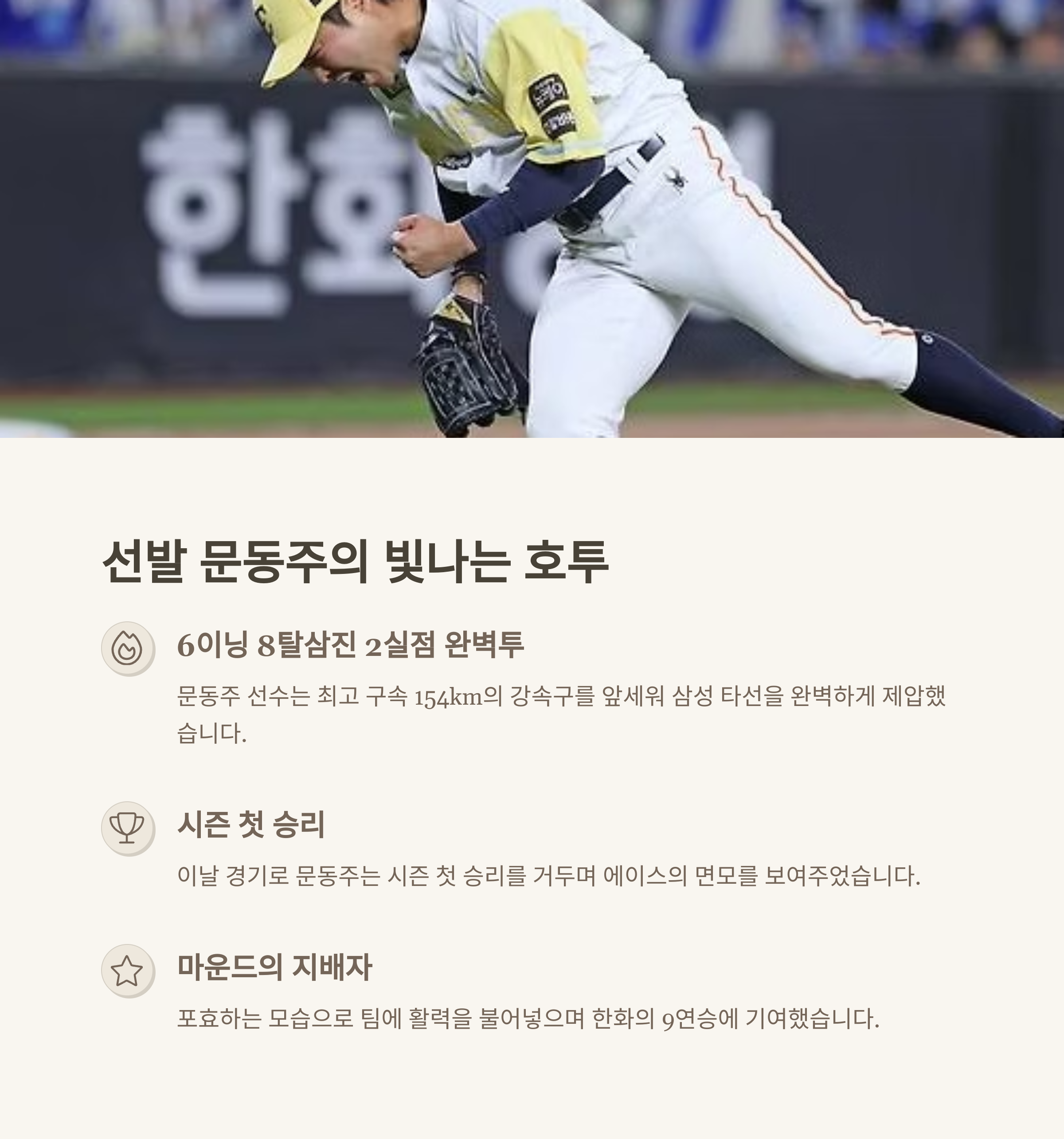 한화 이글스의 9연승 중심엔 단연 문동주가 있습니다. 이날 선발로 나선 그는 최고 구속 156km의 강속구를 앞세워 6이닝 2실점으로 4승째를 따냈죠. 1회초부터 빠른 템포로 경기 흐름을 장악하며 상대 타선을 억제하는 모습은 마치 리그 에이스의 면모였습니다. 이어 김범수가 1.2이닝을 무실점으로 틀어막으며 위기 상황을 완벽히 소화했고, 그 외 계투진도 집중력 있는 피칭으로 9회까지 리드를 지켜냈습니다. 마운드의 ‘팀워크’가 만든 승리, 단순한 재능을 넘어선 완성형 야구였습니다.
