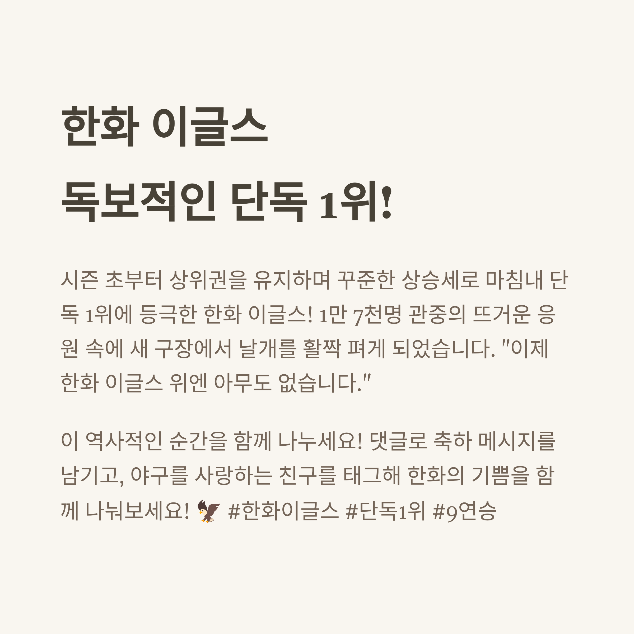 20년을 기다린 그 순간, 우리는 마침내 ‘행복한 한화팬’이 될 수 있었습니다. 이젠 과거의 패배보다, 현재의 희망과 미래의 우승을 이야기할 수 있는 시간입니다. 경기가 끝났지만 팬들의 응원은 계속되고 있어요. 저는 대전에서 그 감동을 온몸으로 느끼고 돌아왔고, 지금 이 글을 쓰면서도 가슴이 벅찹니다. 아직 한화의 야구는 끝나지 않았고, 진짜 이야기는 지금부터입니다. 올 시즌, 한화와 함께 웃고 울 준비 되셨나요? 이게 바로 한화야구입니다.