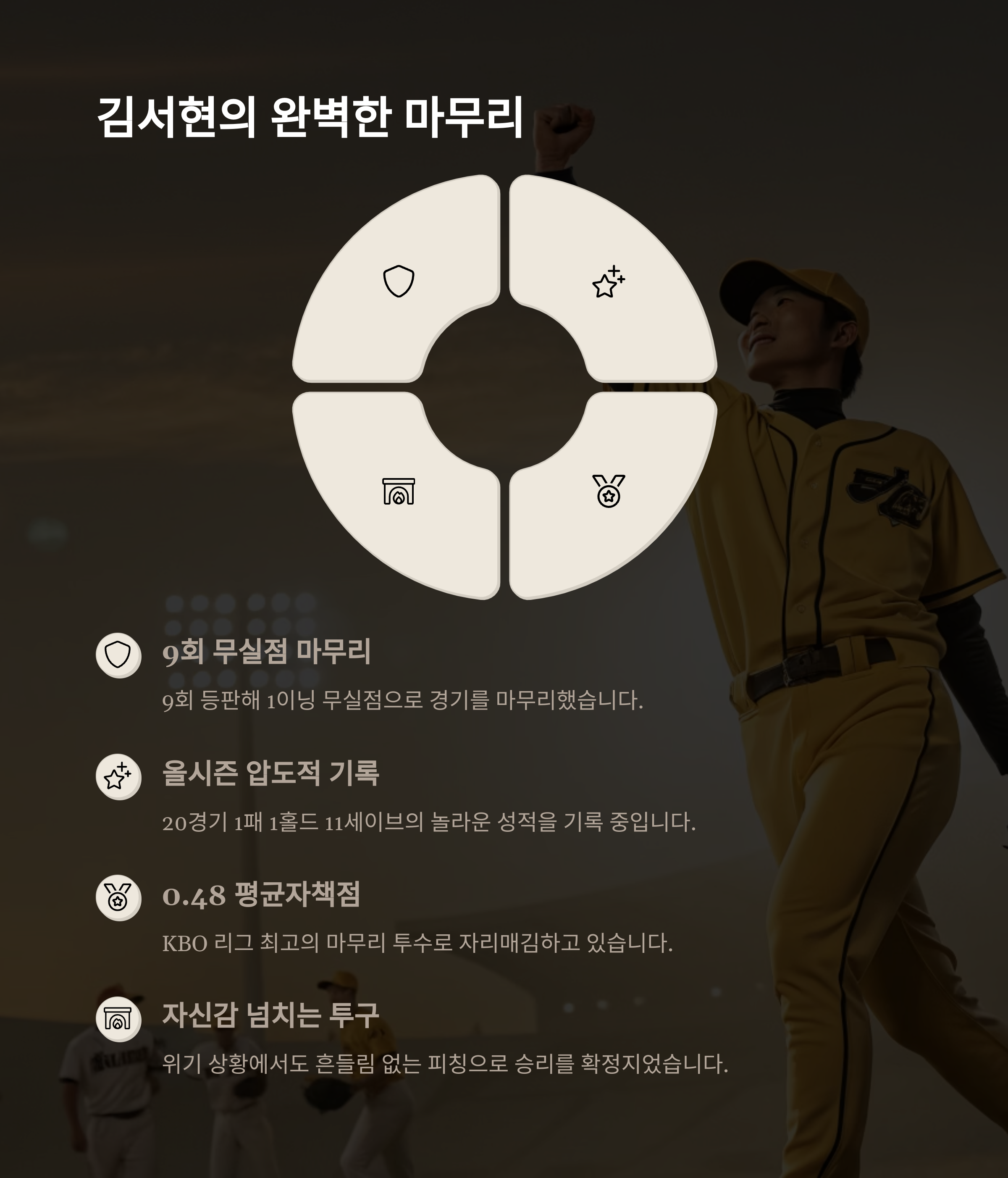 한화 이글스의 9연승 중심엔 단연 문동주가 있습니다. 이날 선발로 나선 그는 최고 구속 156km의 강속구를 앞세워 6이닝 2실점으로 4승째를 따냈죠. 1회초부터 빠른 템포로 경기 흐름을 장악하며 상대 타선을 억제하는 모습은 마치 리그 에이스의 면모였습니다. 이어 김범수가 1.2이닝을 무실점으로 틀어막으며 위기 상황을 완벽히 소화했고, 그 외 계투진도 집중력 있는 피칭으로 9회까지 리드를 지켜냈습니다. 마운드의 ‘팀워크’가 만든 승리, 단순한 재능을 넘어선 완성형 야구였습니다.