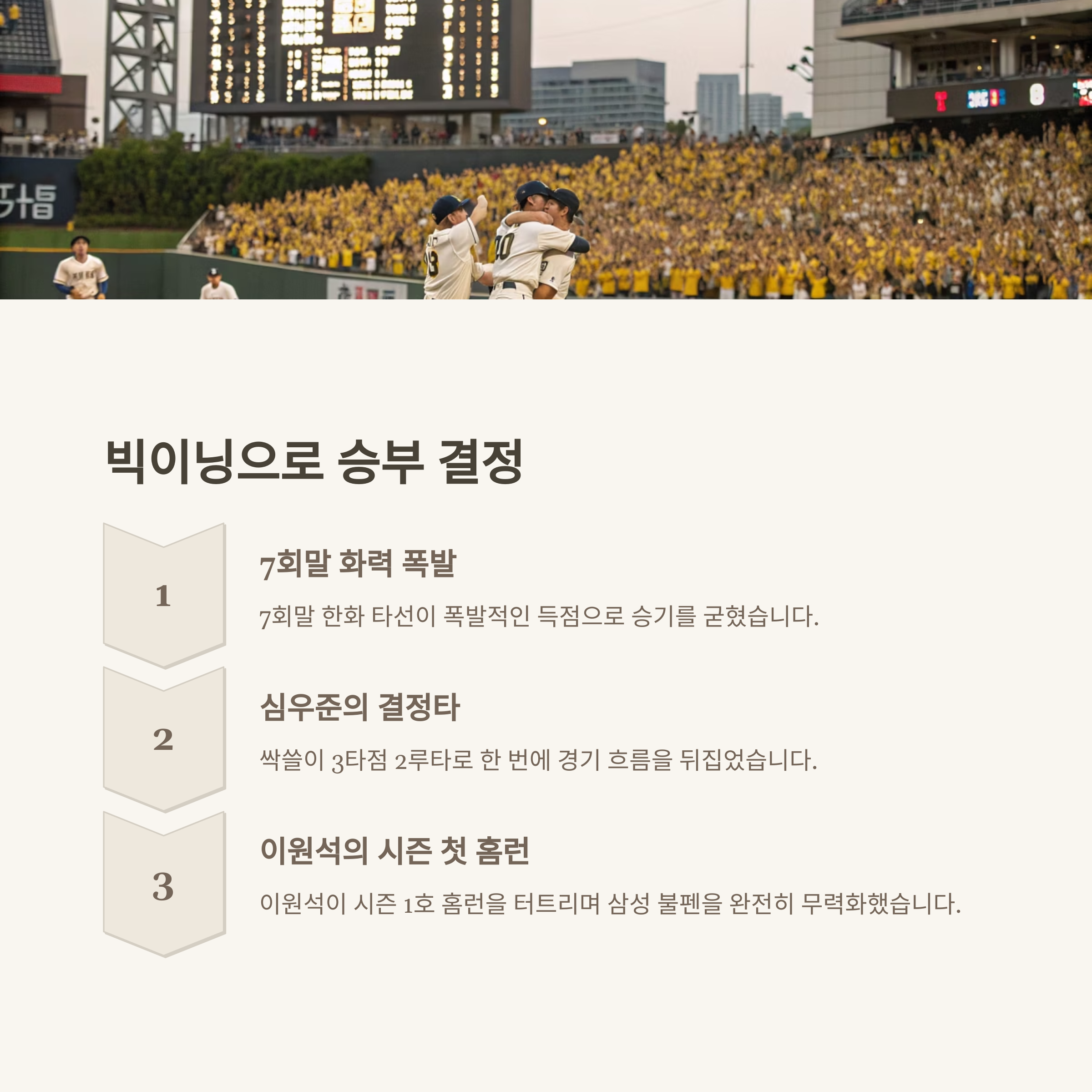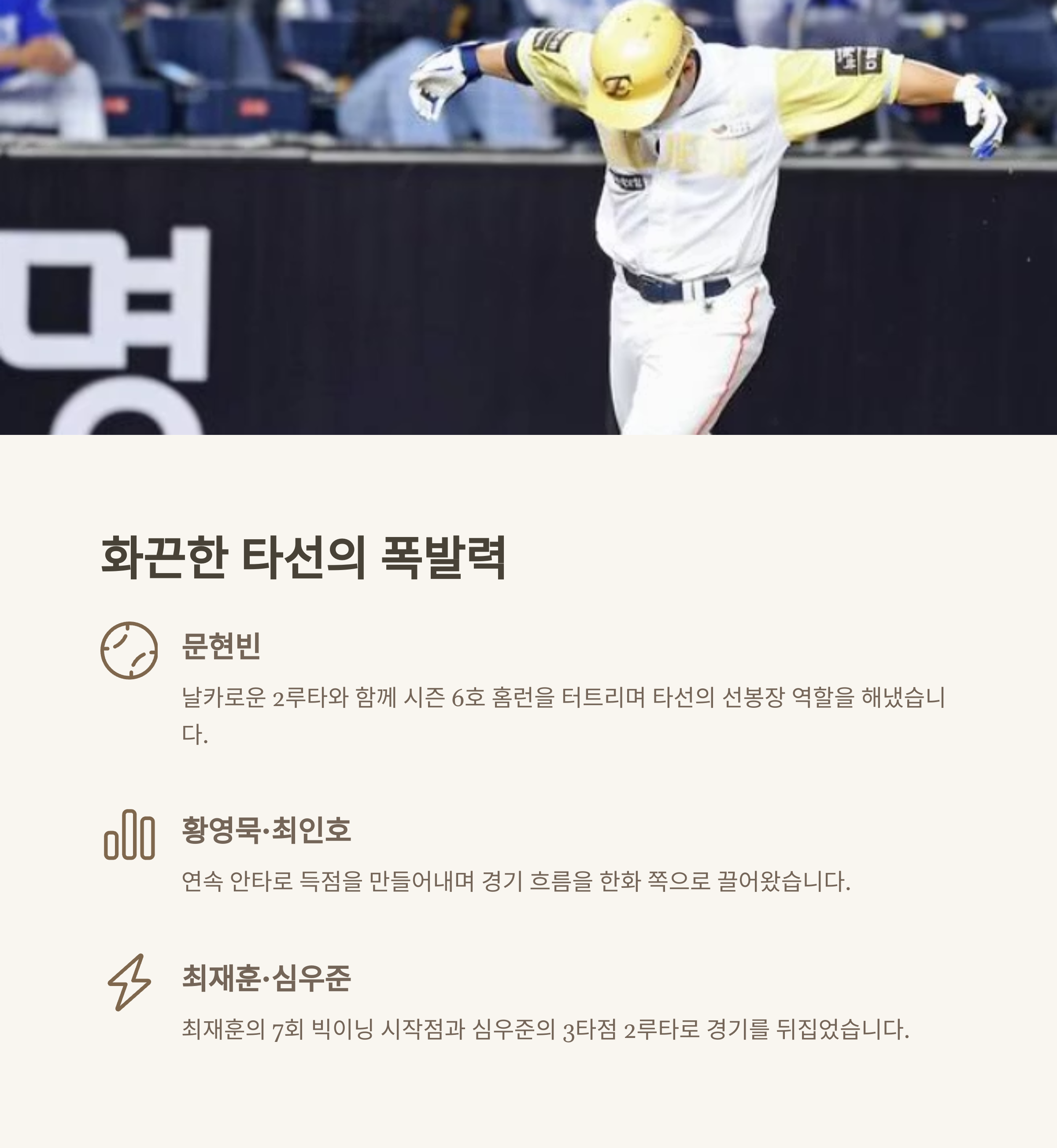마운드가 버텼다면, 타선은 폭발했습니다. 이날 경기에서 한화는 총 13안타 10득점을 기록하며 화끈한 공격력을 과시했어요. 특히 문현빈은 3안타 1홈런 2타점, 최재훈은 2안타로 중심 타선의 역할을 톡톡히 해냈고, 심우준은 3타점 2루타로 찬스를 완벽히 살렸습니다. 여기에 이원석이 쏘아올린 좌월 홈런은 경기장을 눈물바다로 만든 순간이었죠. 단순한 활약을 넘어, 선수 개개인이 팀을 위한 플레이에 집중하는 모습이 인상 깊었습니다.