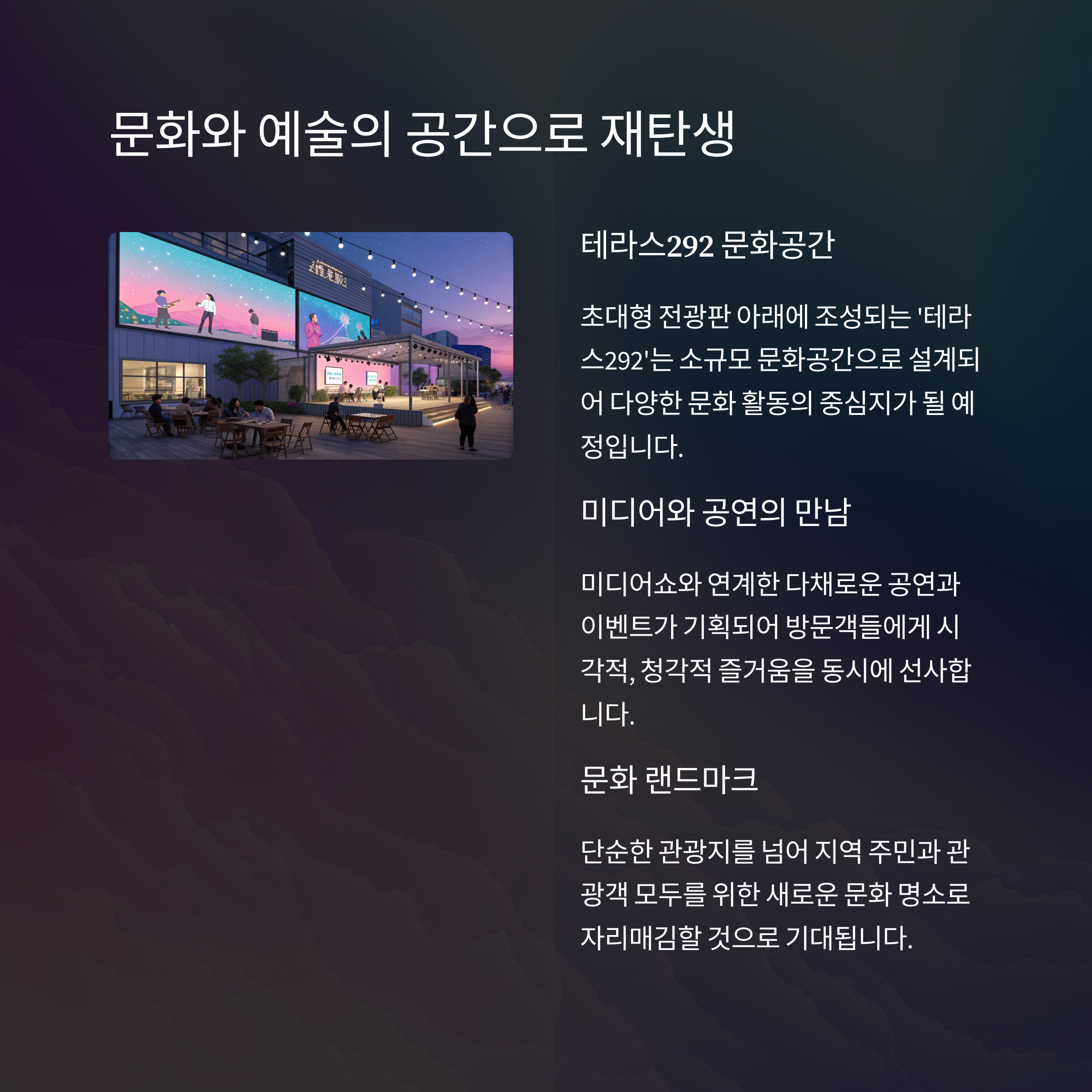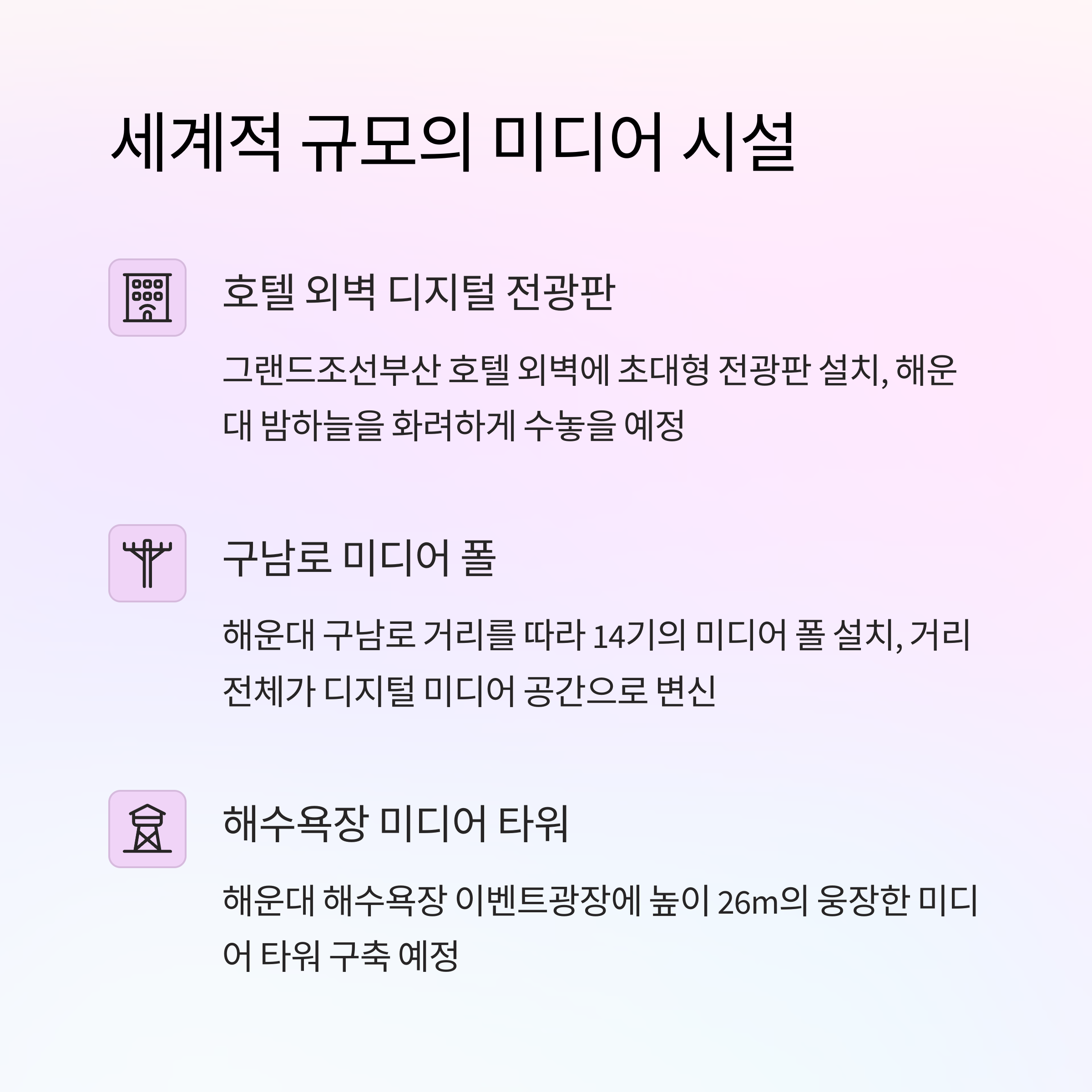 해운대 미디어거리는 단순한 전광판이 아닙니다. 뉴욕 타임스스퀘어처럼 초대형 디지털 스크린을 중심으로 한 영상 콘텐츠 전시 거리로 조성되며, 관광객들이 머무는 순간에도 영상과 빛, 음악이 흐르는 역동적인 공간을 지향합니다. 미디어 타워와 폴 형태의 조형물이 도심 곳곳에 배치돼, 시각적으로도 압도적인 풍경을 자랑할 예정입니다.