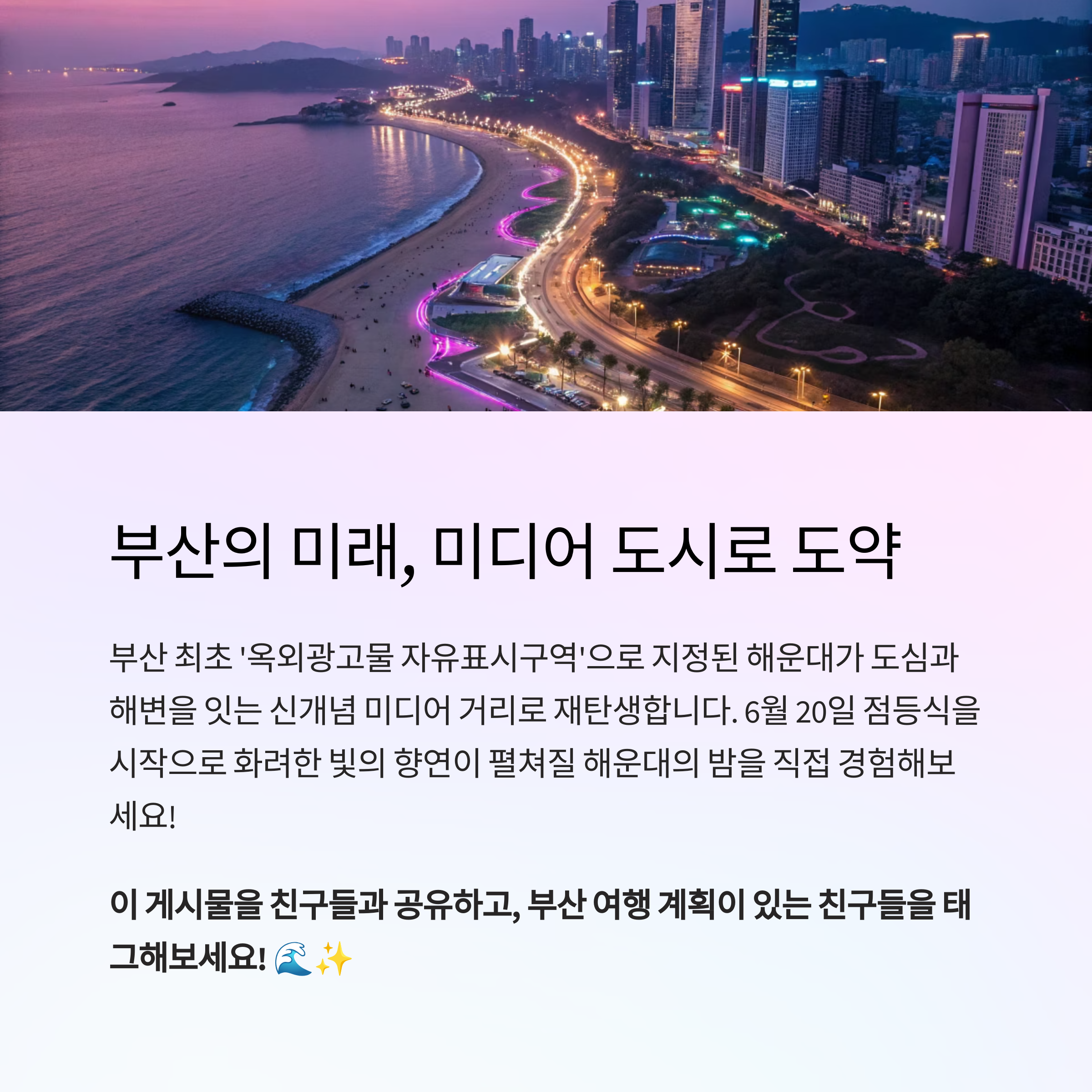 해운대의 밤이 새롭게 달라집니다. 파도 소리와 조명, 디지털 영상이 어우러지는 이 미디어거리는 단순한 관광지를 넘어 부산의 새로운 상징이 될 것입니다. 야경을 사랑하는 분들이라면 꼭 한 번 방문해보셔야 할 새로운 명소죠. 눈으로 보고, 귀로 듣고, 사진으로 남기는 특별한 순간이 이 거리에 기다리고 있습니다. 올여름, 해운대의 변신을 직접 체험해보세요!
