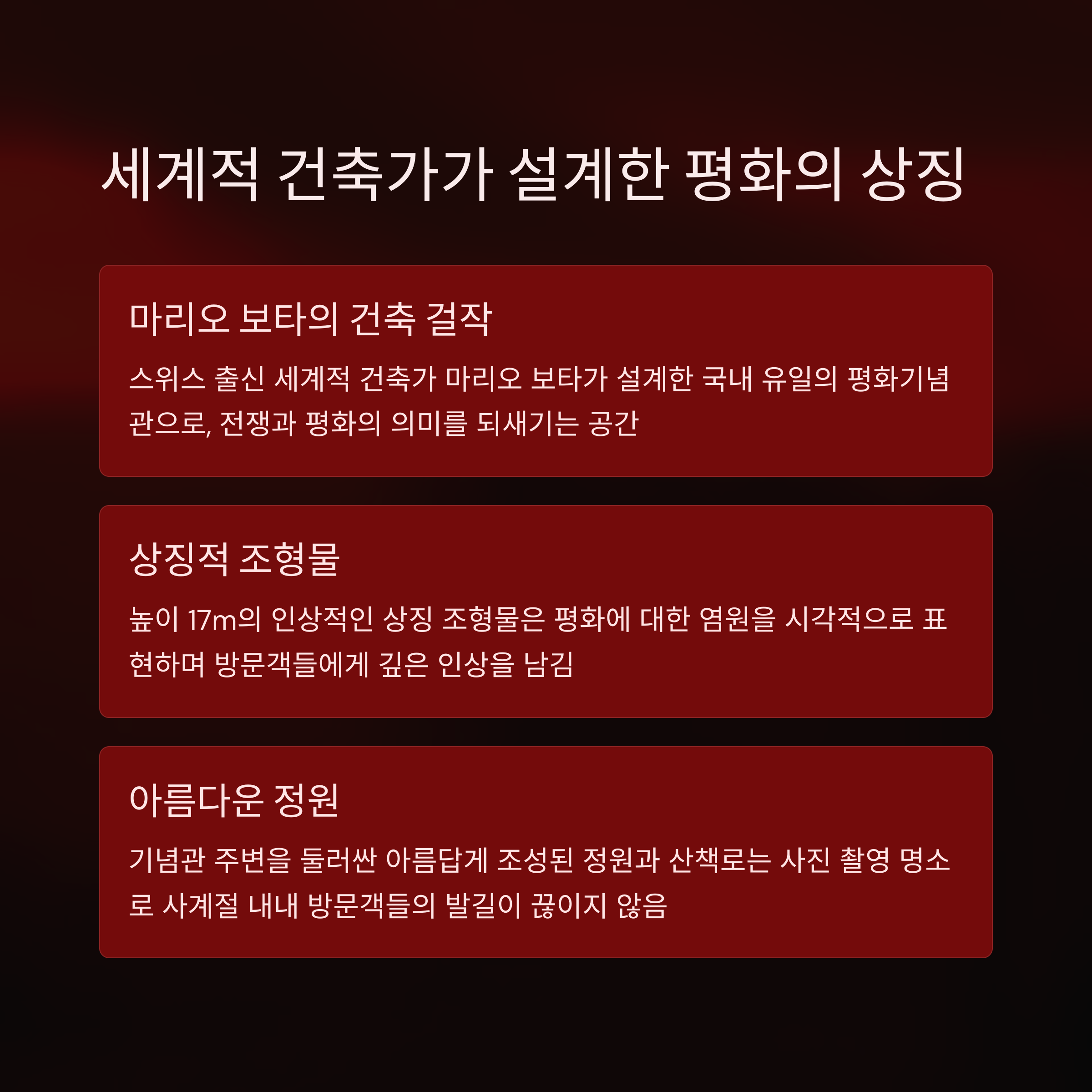 매향리는 1951년부터 54년간 주한 미 공군의 사격 훈련장이었던 곳입니다. 그 긴 세월 동안 주민들은 소음과 환경 피해를 감내해야 했죠. 하지만 2005년 부지 반환 이후, 주민들과 지자체의 노력으로 이 땅은 평화와 생태를 상징하는 공간으로 탈바꿈하게 되었습니다. 특히 스위스 건축가 마리오 보타가 설계한 ‘매향리평화기념관’은 그 상징성을 고스란히 담고 있어 방문객들에게 깊은 인상을 줍니다.