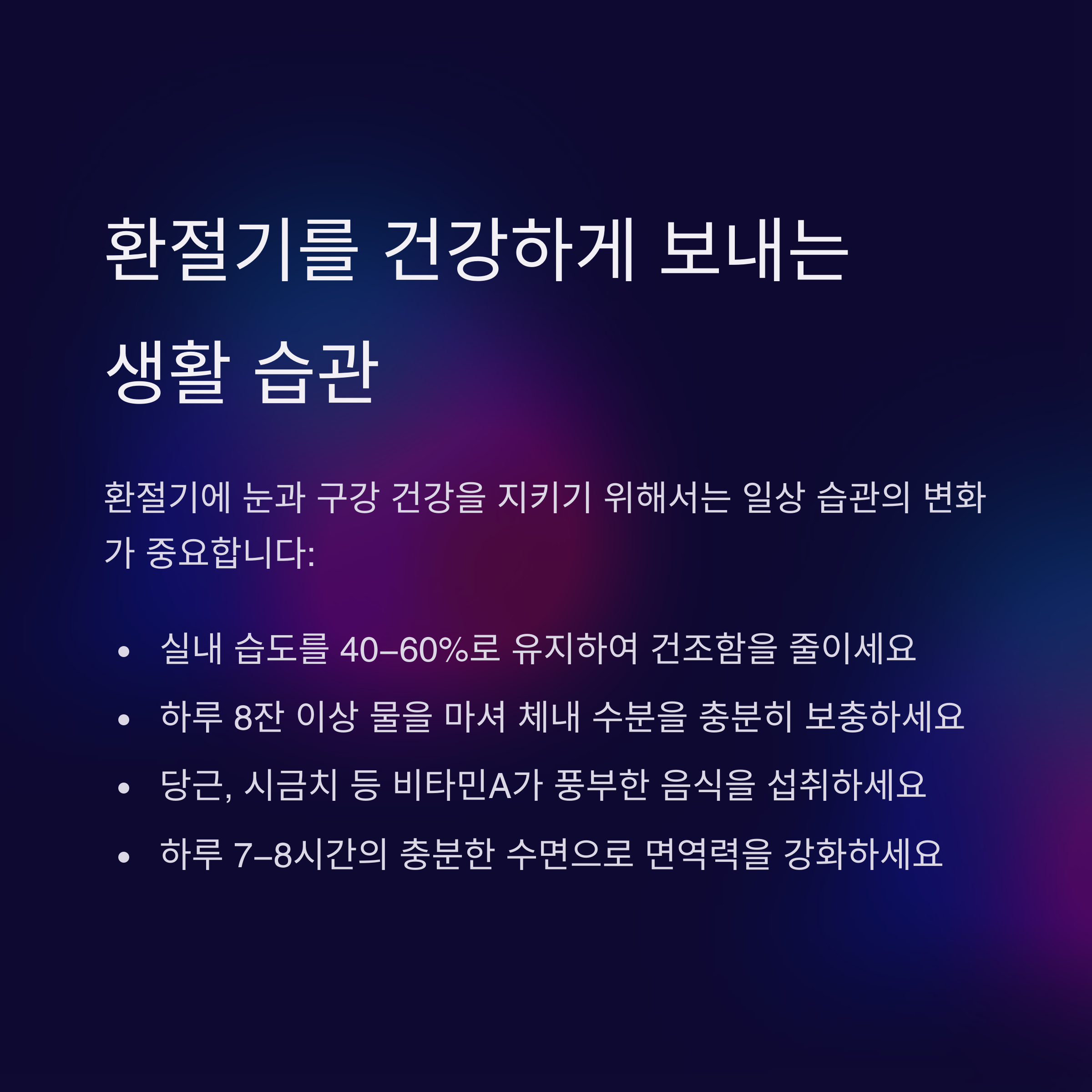 환절기에는 작지만 불편한 변화들이 우리 몸 곳곳에서 나타나요. 특히 눈과 입처럼 매일 사용하는 기관은 더 민감하게 반응하죠. 오늘 소개한 방법들, 사실 별거 아닌 것 같아 보여도 꾸준히 실천하면 꽤나 큰 차이를 만들 수 있어요. 우리 모두 이 계절을 조금 더 편안하게, 덜 건조하게 보낼 수 있었으면 좋겠습니다.