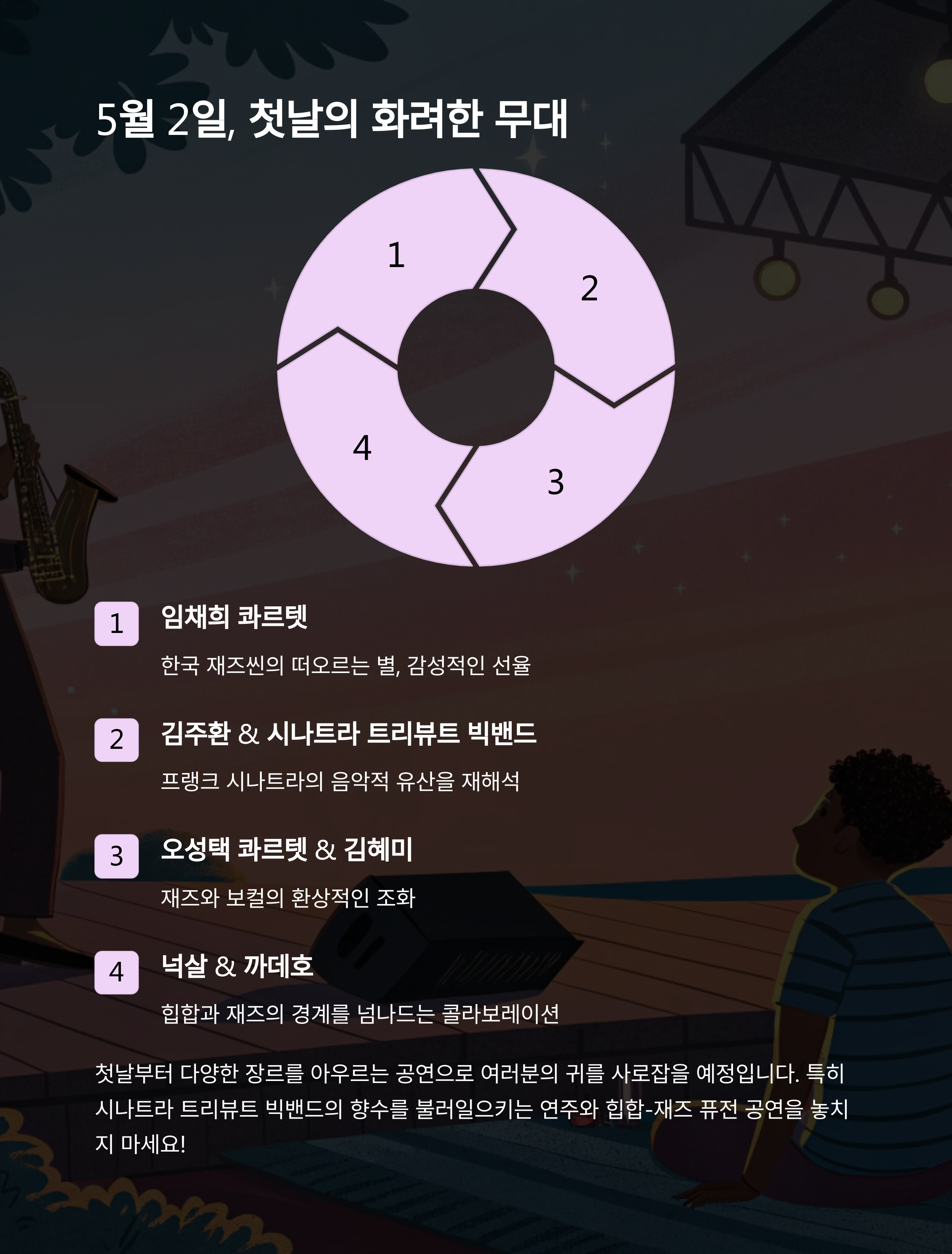 | 5월 2일 | 임채희 콰르텟, 김주환과 시나트라 트리뷰트 빅밴드 | 댄스존, 미니 사인회 |