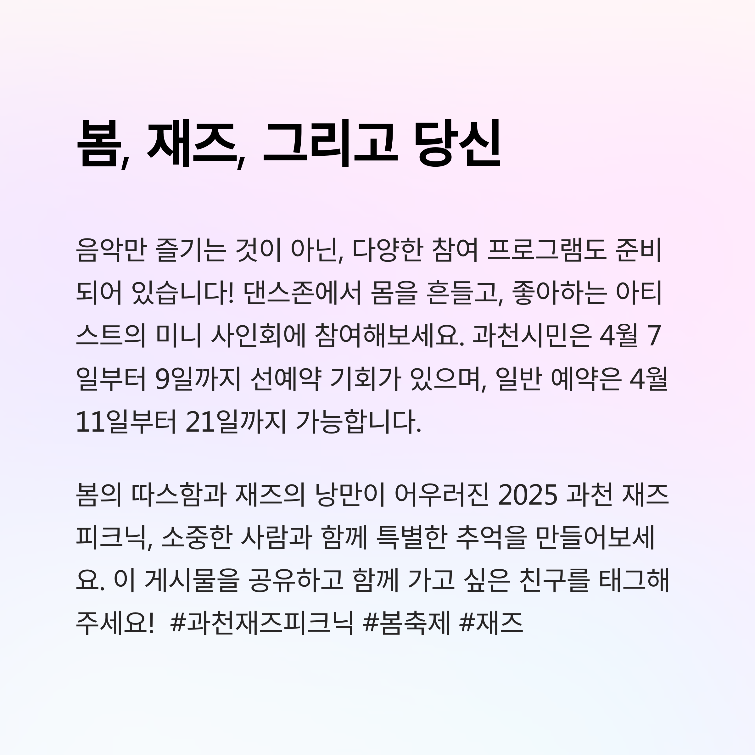 이번 봄, 도심 속에서 자연과 음악이 어우러지는 특별한 시간을 과천 재즈 피크닉에서 보내보세요. 마음을 울리는 재즈 선율과 여유로운 피크닉 분위기가 일상에 지친 당신에게 힐링을 선사할 거예요. 아티스트들의 생생한 연주와 함께 봄날의 행복을 만끽하며 소중한 사람들과 추억을 만들어보세요. 이 축제를 통해 잊지 못할 음악 여행이 되길 바랍니다. 현장에서 만나요!