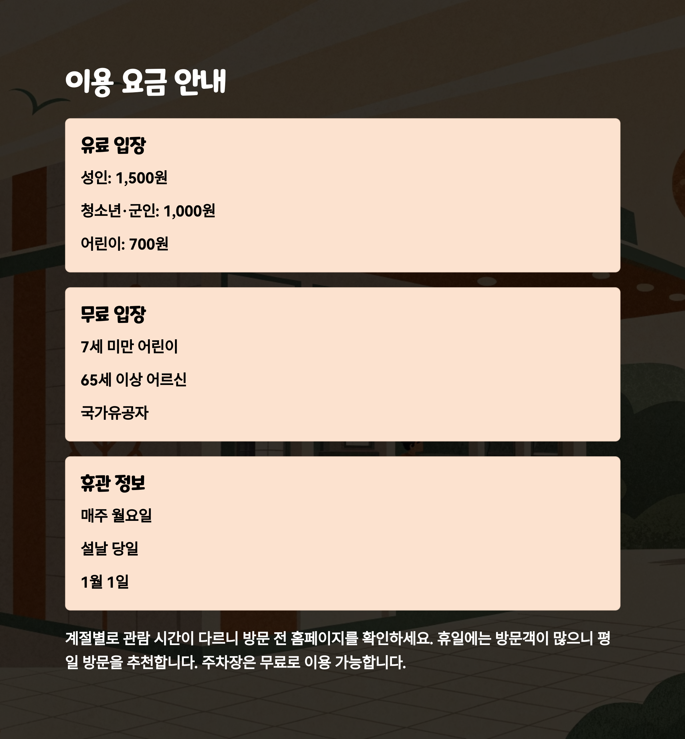 | 음식/물 준비 | 내부에 식당, 매점, 자판기 없음 → 도시락과 생수 지참 필수 |