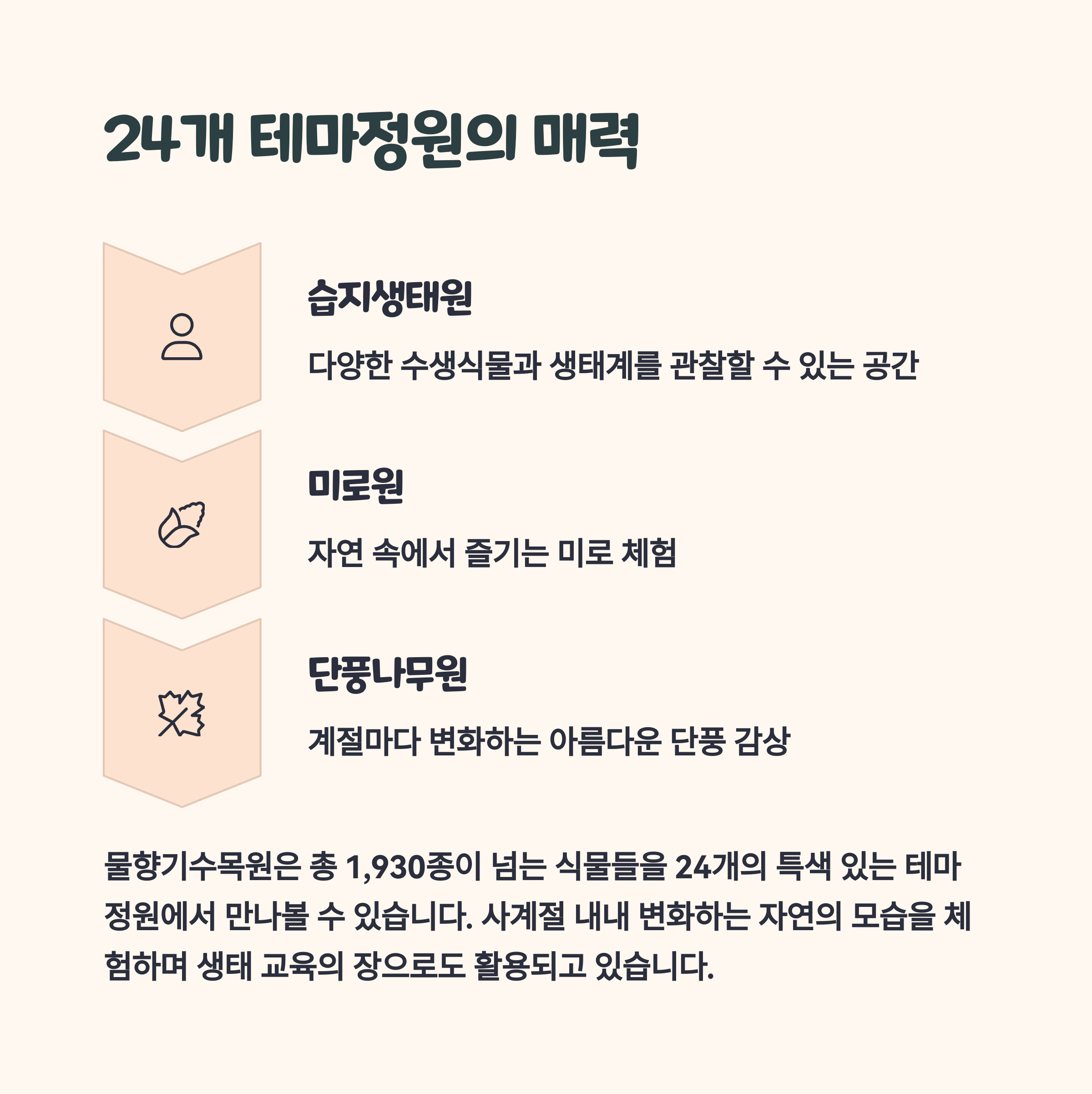 물향기수목원은 단순히 나무만 있는 공간이 아닙니다. 24개의 테마 정원으로 구성된 이곳은 다양한 식물을 주제로 조성되어 있어 계절마다 다른 풍경을 즐길 수 있어요. 숲속 쉼터, 무궁화동산, 분재원, 잔디마당 등 가족 단위나 연인끼리 방문해도 충분히 여유로운 시간을 보낼 수 있답니다.