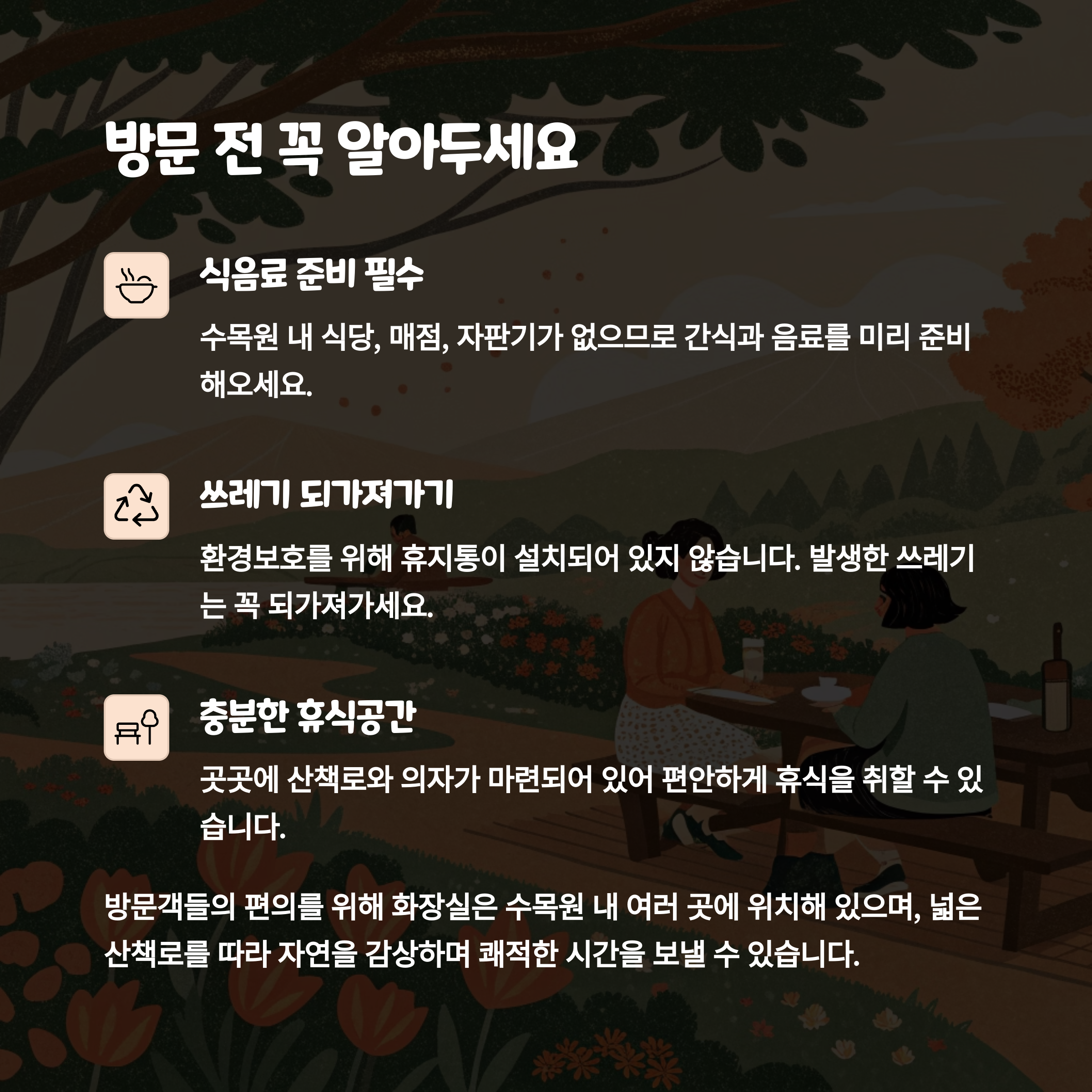 덕분에 쾌적한 공기와 깨끗한 환경을 유지할 수 있지만, 일반 공원과는 조금 다른 이용 수칙도 존재해요. 방문 전에 아래 내용을 꼭 체크해보세요.