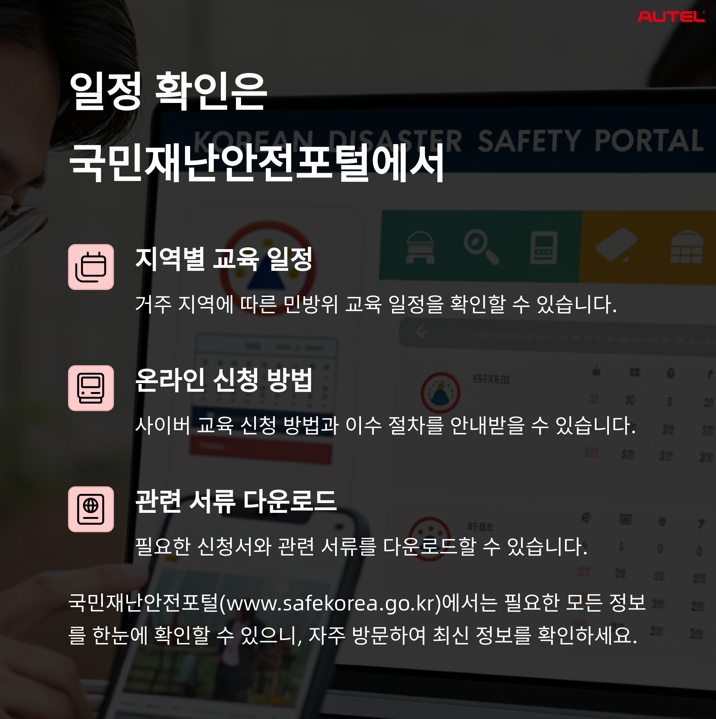 사이버교육은 국민재난안전포털에서 PC, 모바일, 태블릿으로 모두 수강 가능하며, 편한 시간대에 접속해서 들을 수 있다는 장점이 있습니다.