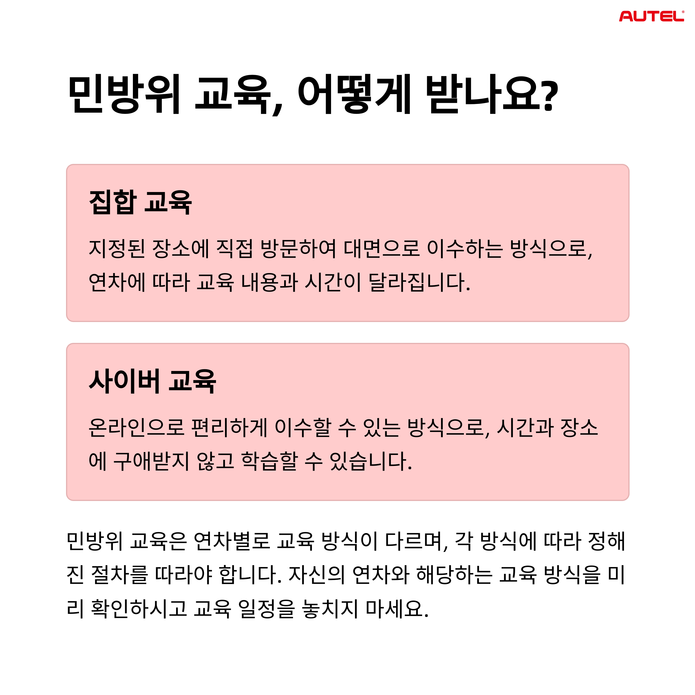 2025년부터 민방위 교육은 연차와 역할에 따라 교육 방식이 달라집니다. 1~2년 차는 집합교육, 3년 차 이상은 사이버교육이 기본이며, 민방위대장과 기술지원대는 예외적으로 집합교육을 진행합니다.