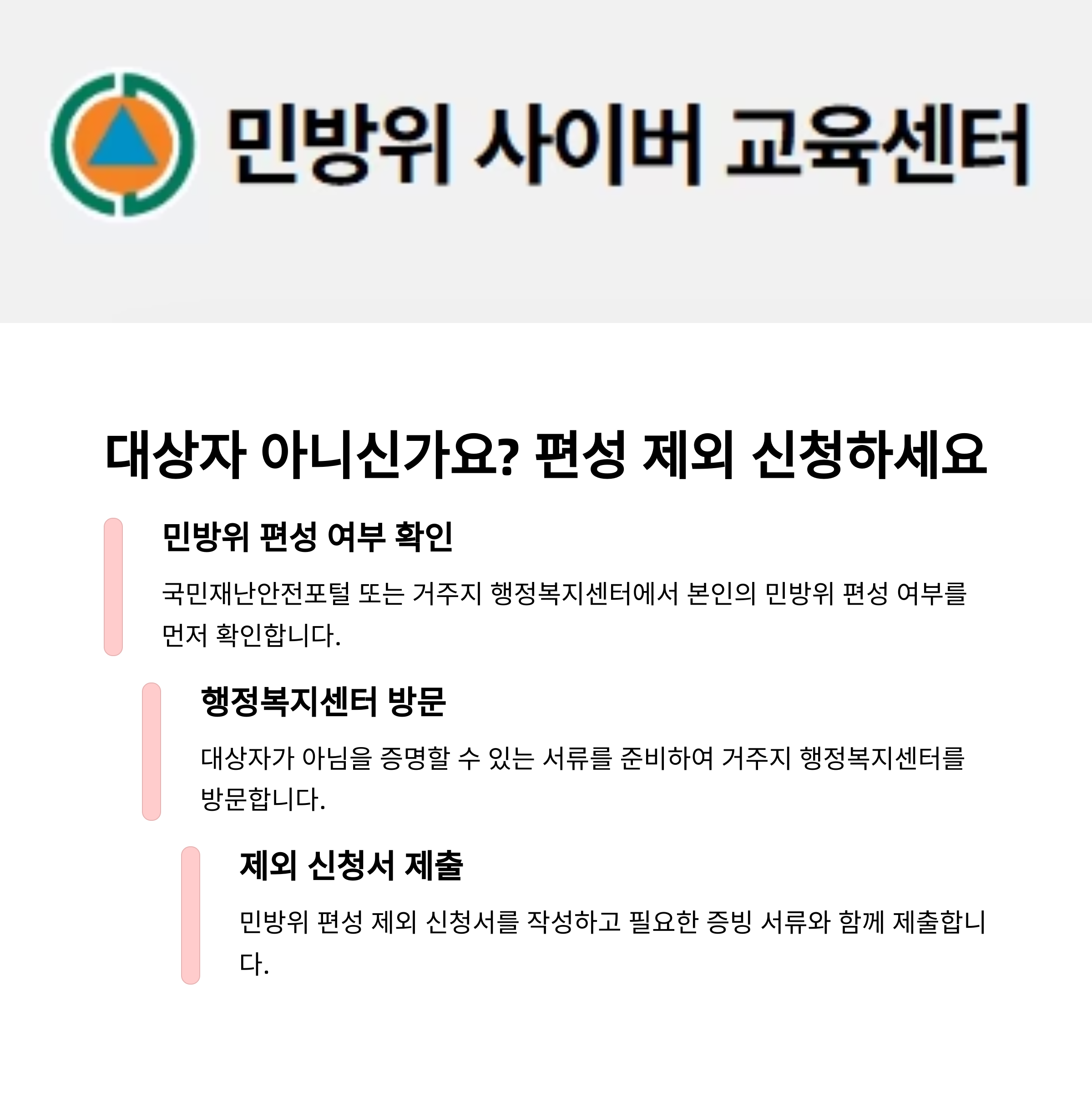 가끔 교육 통지를 받았는데 “내가 왜?” 싶을 수 있어요. 특히 해외 거주나 군 면제자, 특정 직업군 종사자는 편성 제외가 가능한 경우가 있으니 본인의 상황을 꼭 점검해보세요. 민방위 편성 여부는 주소지 관할 행정복지센터에서 확인 가능합니다.