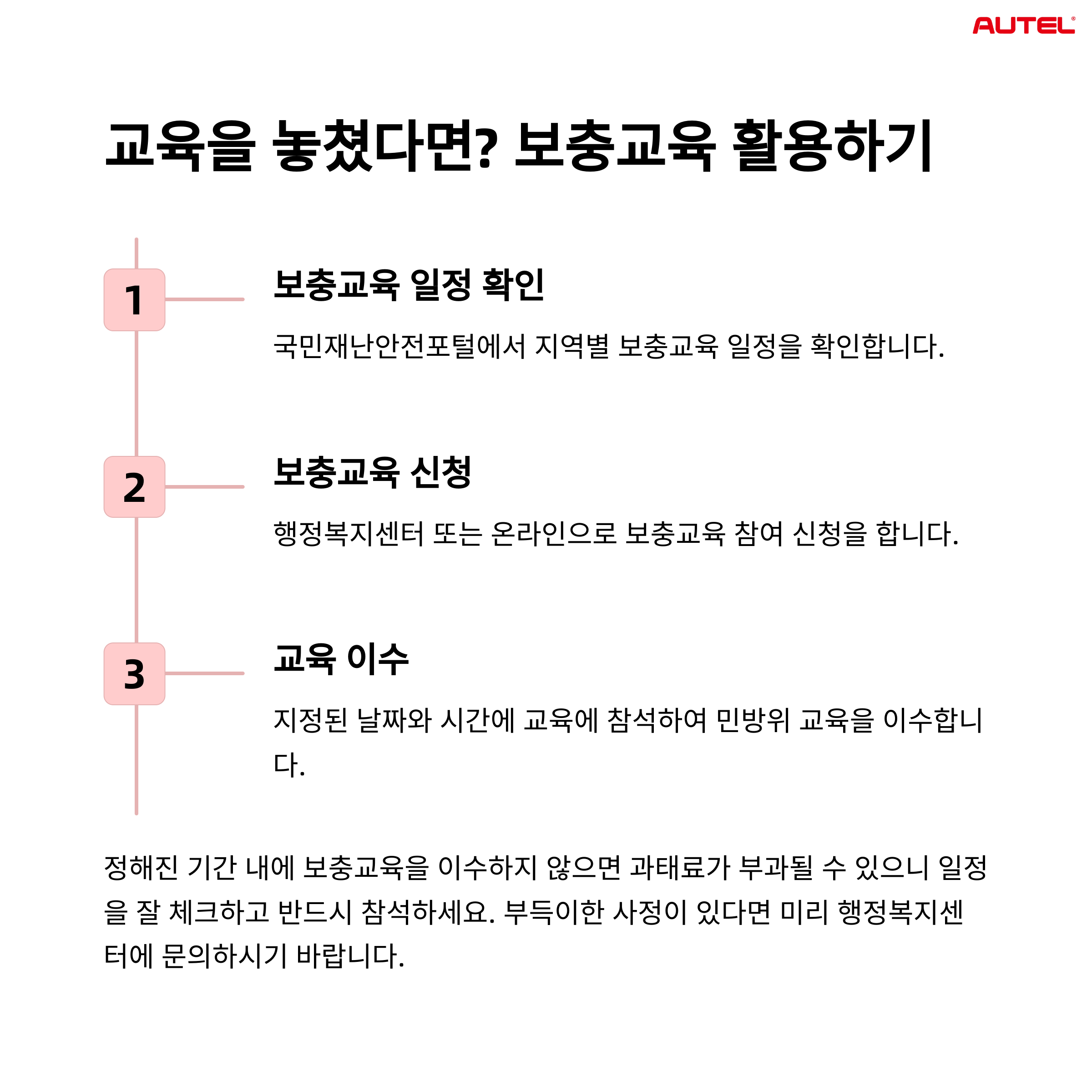 상반기에 집합교육 혹은 사이버교육을 놓친 경우, 하반기 보충 교육 기회가 주어집니다. 문제는 하반기까지 모두 놓쳤을 때인데요, 이 경우에는 반드시 주소지 관할 행정복지센터에 연락해서 추가 교육이 있는지 확인하셔야 합니다.