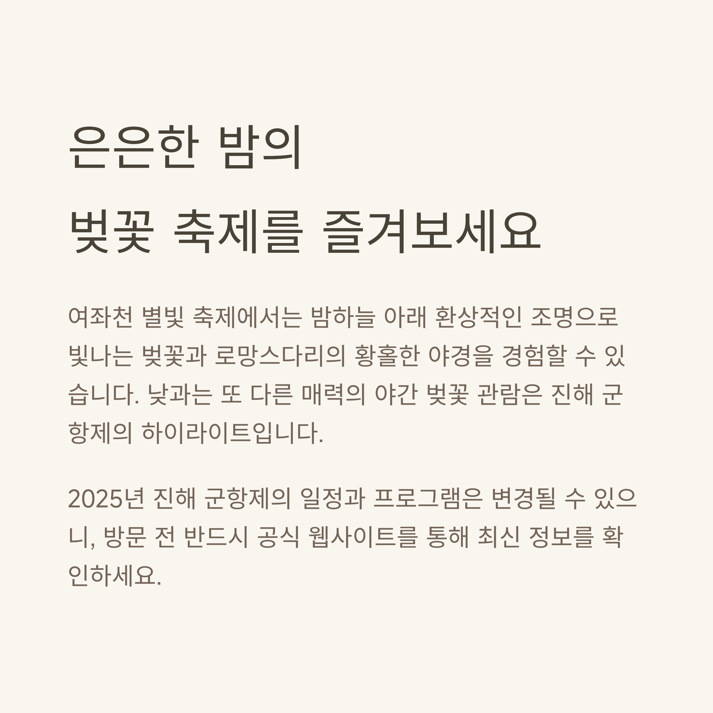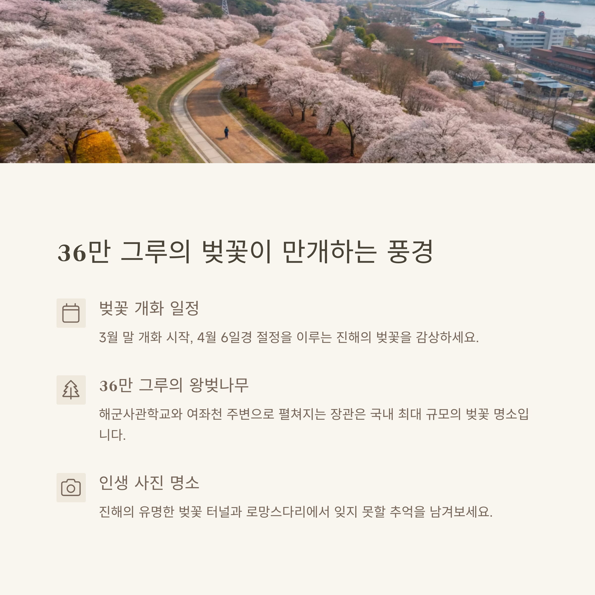 자, 이제 진해 군항제 일정과 꿀팁까지 모두 정리해봤는데요, 벚꽃 여행의 설렘이 조금이나마 전해졌길 바라요. 저도 이번 봄에 또 진해로 떠날 예정인데, 혹시 여러분도 가신다면 댓글로 일정 공유해요! 직접 다녀오신 분들의 소소한 후기도 너무 기다리고 있답니다. 다 같이 예쁜 봄날 만들어요 :)