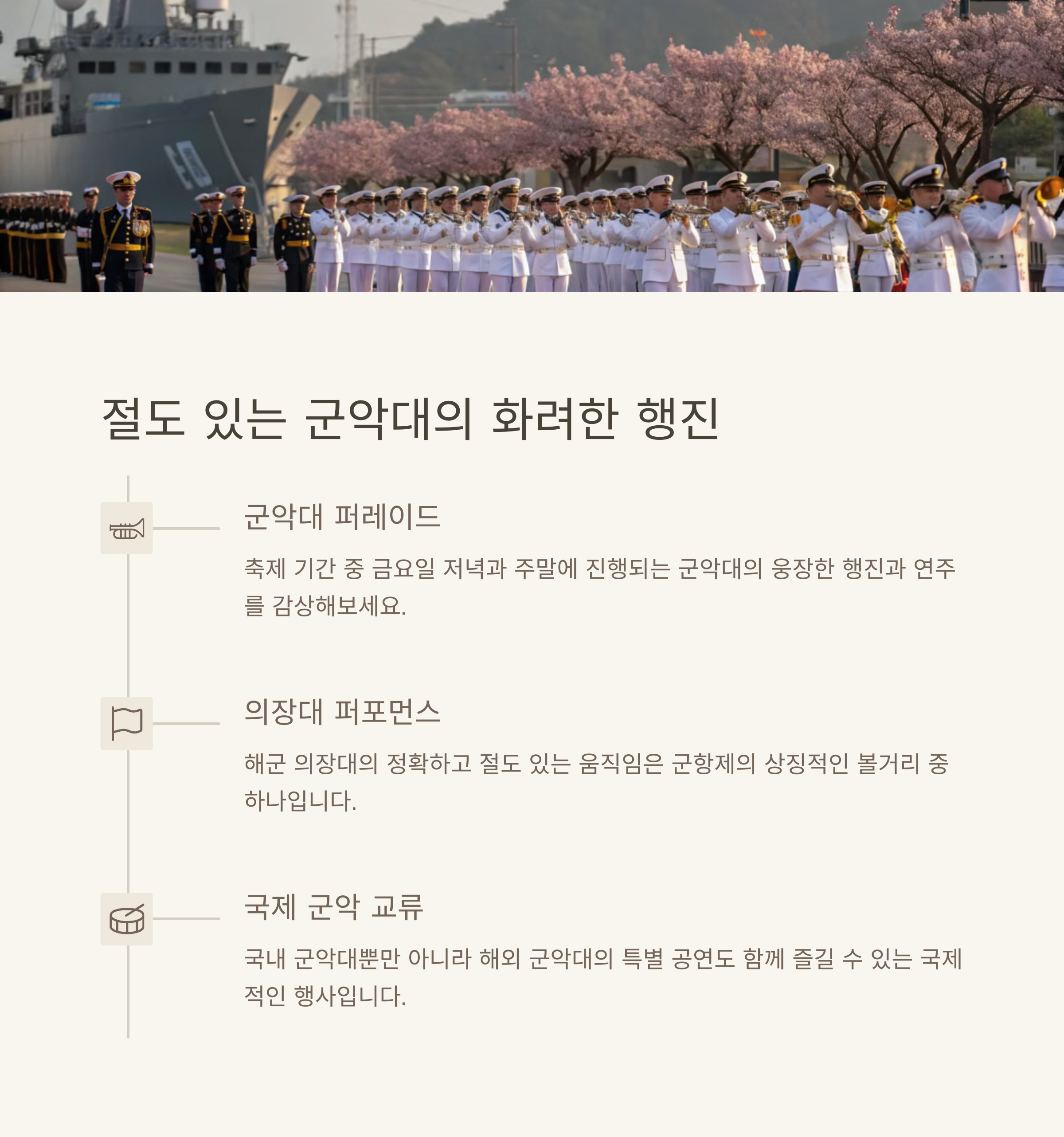 해군사관학교와 해군 군악대가 참여하는 퍼레이드로, 진해 군항제의 전통적인 상징 행사예요. 국방의 멋을 제대로 느낄 수 있죠.