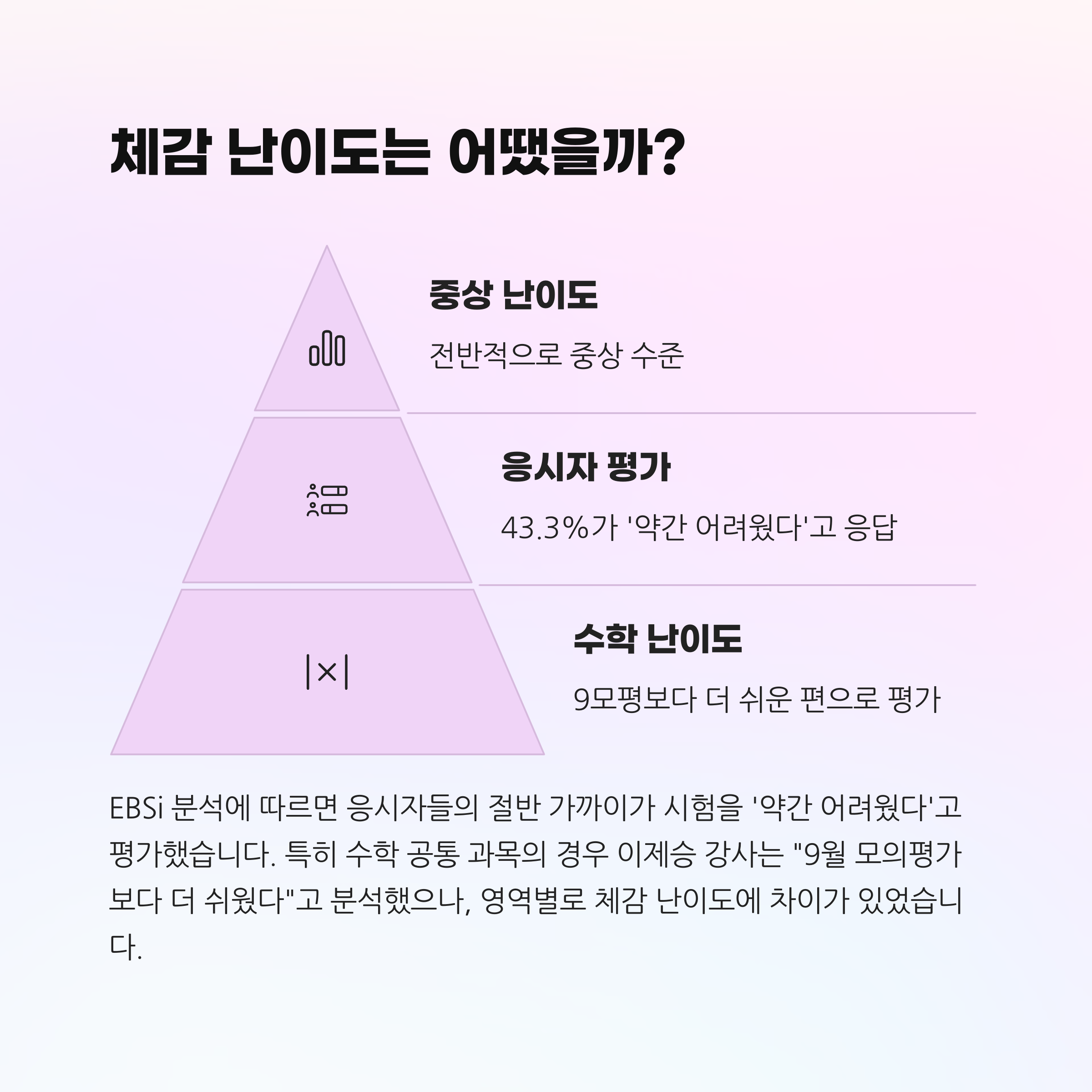이번 5월 모의고사에서 가장 큰 화제가 된 부분은 바로 체감 난이도였습니다. EBSi에 등록된 약 3만 7천 건의 응시생 후기를 기반으로 분석한 결과, ‘약간 어려웠다’는 반응이 가장 많았어요. 특히 국어에서는 독서 지문이 길고 정보량이 많았고, 수학은 미적분과 기하 선택자들의 체감 난도가 확실히 높았다는 의견이 있었습니다. 전체적으로 국어·수학 모두 '중상 정도의 체감 난이도'로 정리할 수 있겠어요.