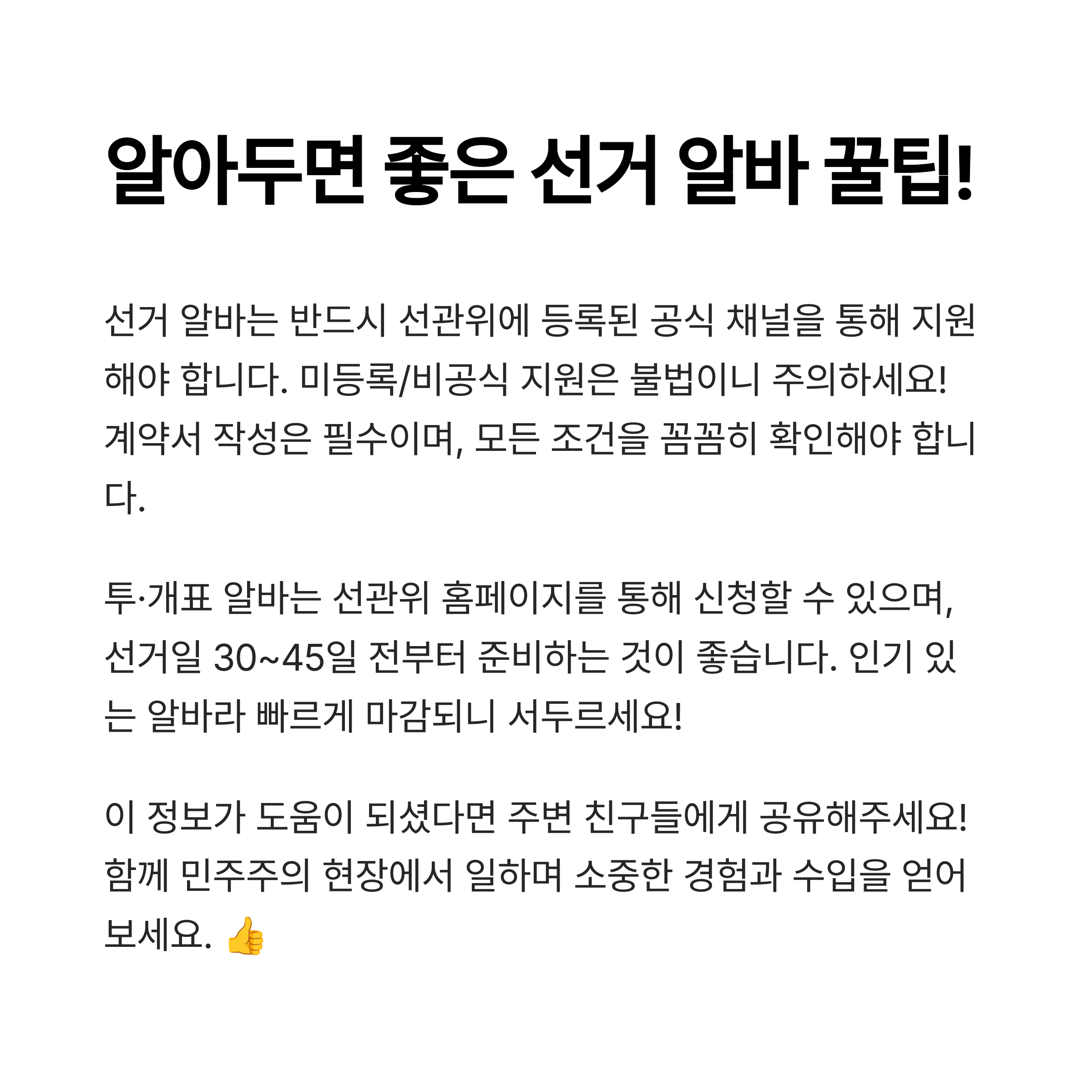 대선 알바는 시급이 높고 기간이 짧아 방학 중 대학생, 프리랜서, 아르바이트 경험 많은 분들에게 특히 추천됩니다. 게다가 정치에 관심이 있거나 사회 활동을 경험해보고 싶은 분들이라면 더할 나위 없는 기회죠. 공식 채널을 통해 정당하게 일하면 안전하고 유익한 경험이 될 수 있습니다. 주의사항만 잘 지킨다면, 이번 대선 기간 중 가장 핫한 단기 알바로 손꼽히는 이유가 분명히 있습니다.
