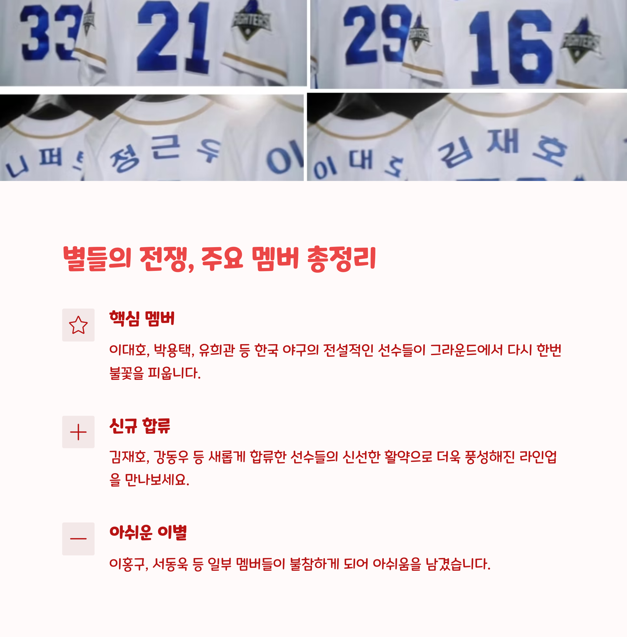 불꽃야구는 단순한 예능이 아닌, 야구 레전드들의 마지막 불꽃과 도전이 담긴 감동의 무대입니다. 특히 이번 고척돔 직관 경기는 김재호의 합류, 신예 선수들의 등장, 대학 강호와의 맞대결 등 다양한 드라마가 펼쳐질 예정이죠. 팬들과 첫 만남을 갖는 이 경기에서, 여러분이 직접 그 감동의 순간을 함께하길 바랍니다. 예매는 단 하루! 4월 22일 오후 2시, 꼭 놓치지 마세요. 이번 기회에 직관으로 ‘진짜 야구의 맛’을 느껴보는 건 어떠세요?
