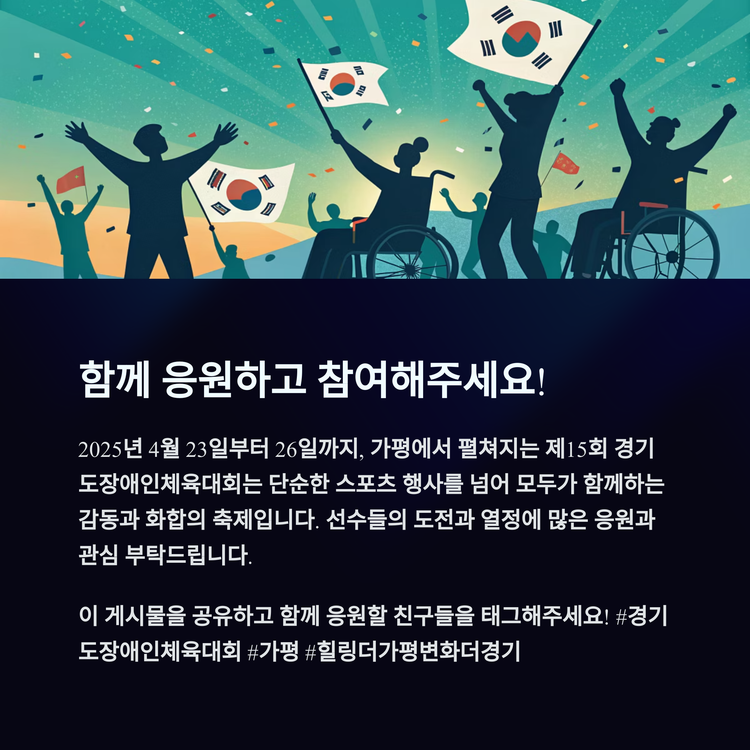 경기를 넘어선 감동, 관광을 넘은 치유. 제15회 경기도장애인체육대회는 모두가 함께하고 공감할 수 있는 진짜 축제입니다. 가평의 청정 자연에서 열리는 이번 행사는 단지 기록을 위한 경기가 아니라, 모든 도민이 ‘연대’와 ‘응원’을 체험하는 특별한 시간일 것입니다. 장애라는 이름의 경계를 넘어, 가평에서 피어날 도전과 화합의 이야기를 직접 만나보세요.