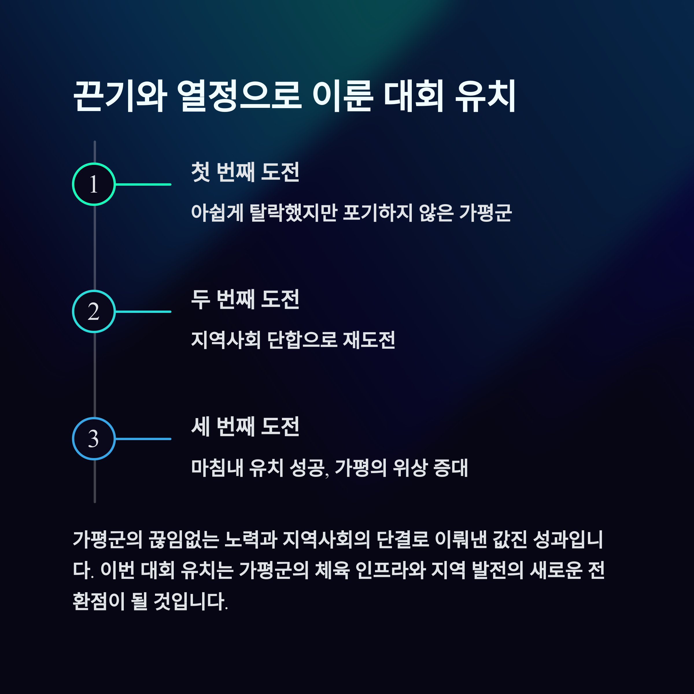 이번 대회는 단순한 스포츠 행사를 넘어 지역 관광·문화와의 연계를 강화하며, 가평의 매력을 전국에 알릴 수 있는 기회가 될 것으로 기대를 모읍니다. 특히 3번의 유치 도전 끝에 처음 개최되는 만큼, 지역에서도 의미 있는 행사로 준비되고 있습니다.