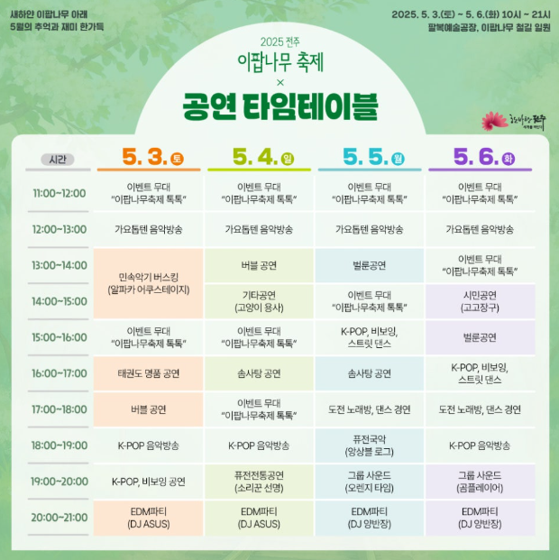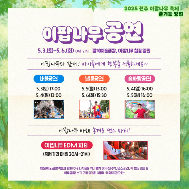 5월의 전주, 팔복동 철길 일대가 하얀 꽃비로 가득 찹니다. '2025 전주 이팝나무 축제'는 5월 3일(토)부터 6일(화)까지 4일 동안 진행되며, 매일 오전 10시부터 밤 9시까지 다채로운 프로그램으로 가득해요. 장소는 전주 팔복예술공장과 이팝나무 철길 일원! 특히 이팝나무 꽃이 만개하는 시즌이라 산책하는 것만으로도 충분히 힐링된답니다. 감성 충만한 봄날, 꼭 한번 걸어봐야 할 코스에요.