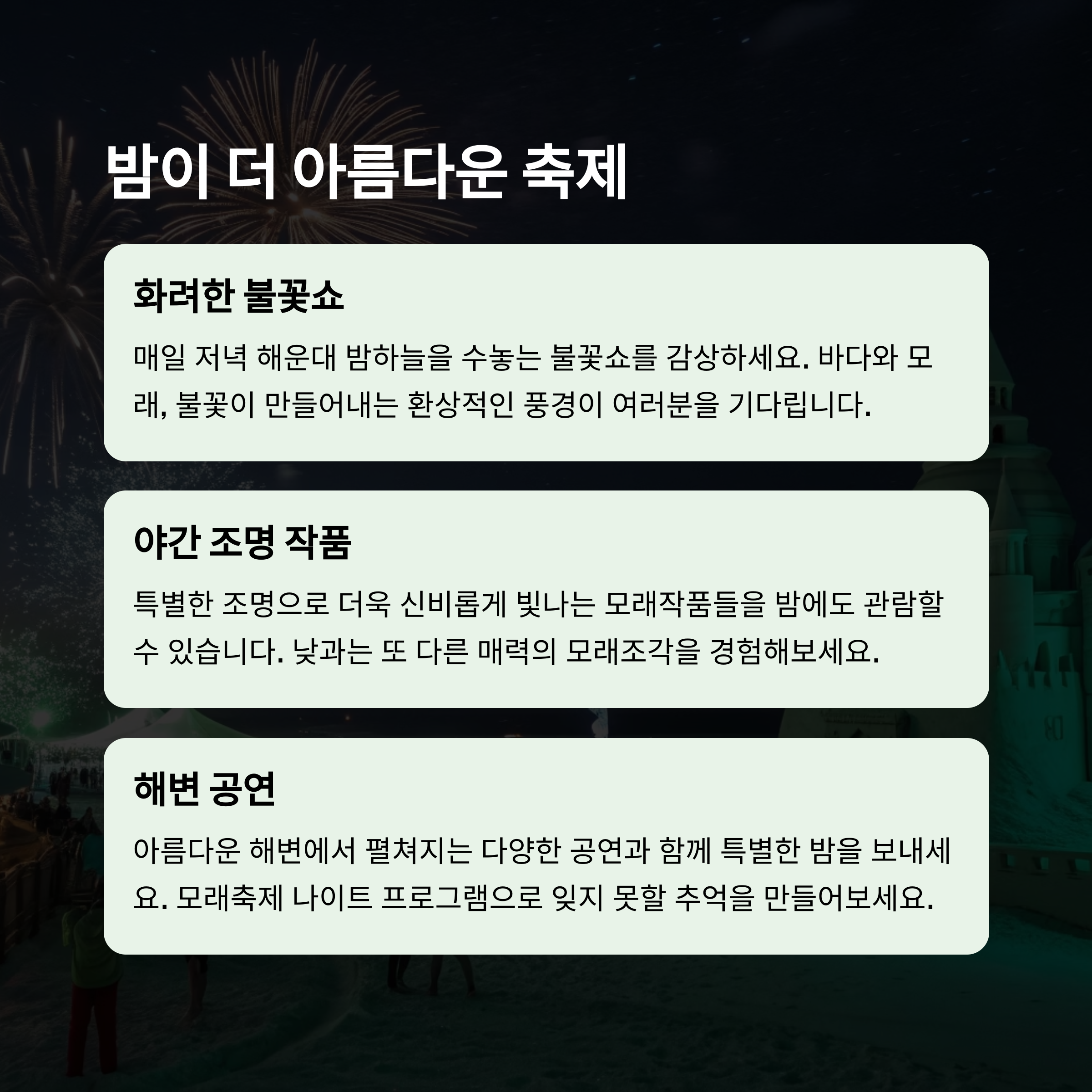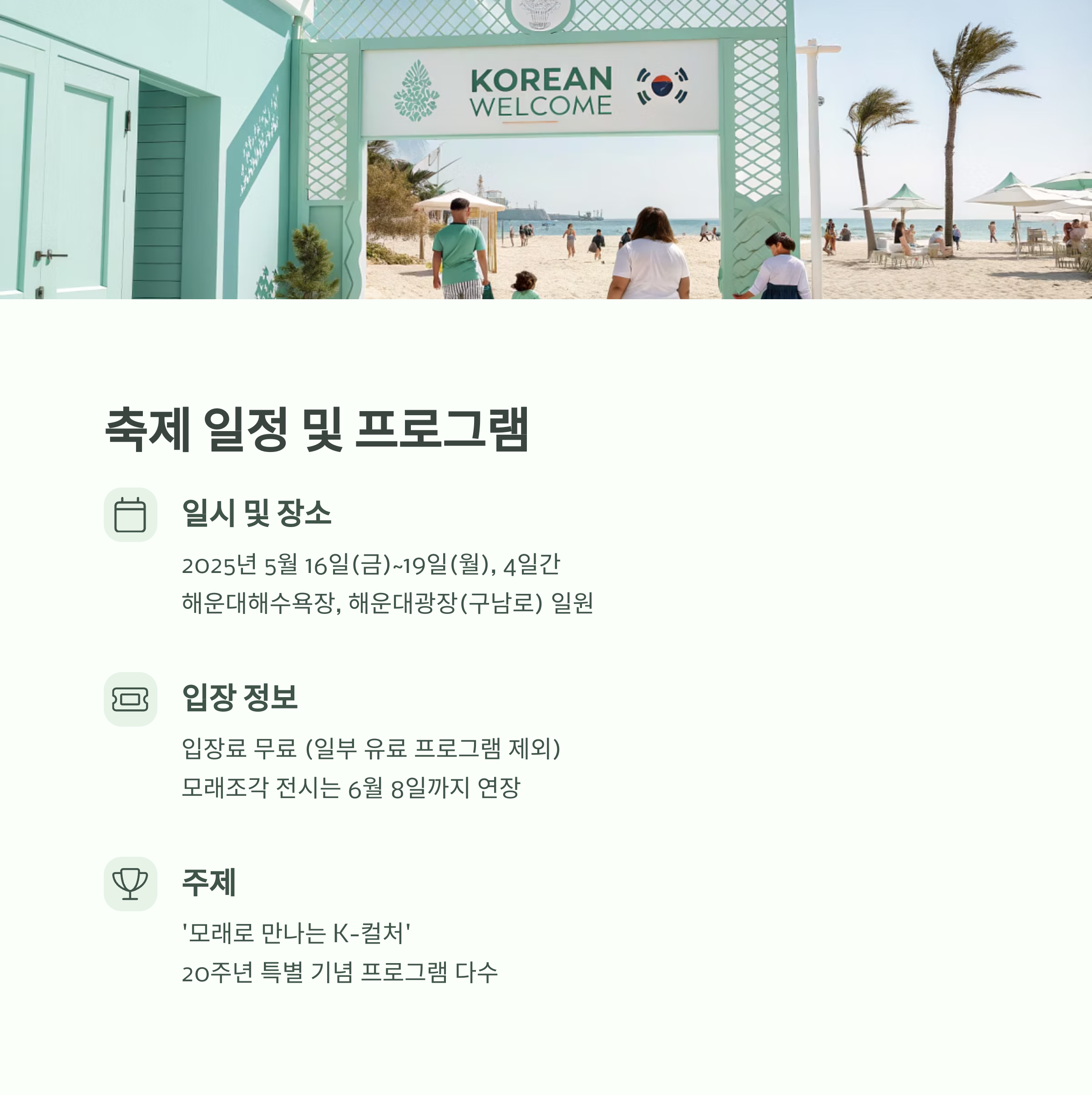 매일매일 색다른 즐거움! 올해 해운대 모래축제는 K-컬처 특화 콘텐츠와 체험형 프로그램이 대거 마련되어 있어요. 가족 나들이는 물론, 20~30대 친구끼리도 완전 추천입니다.